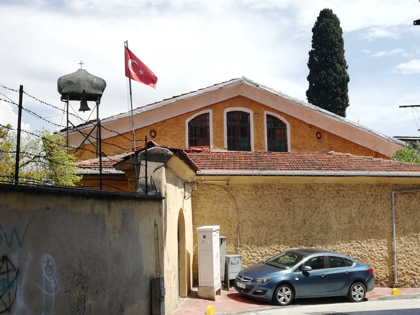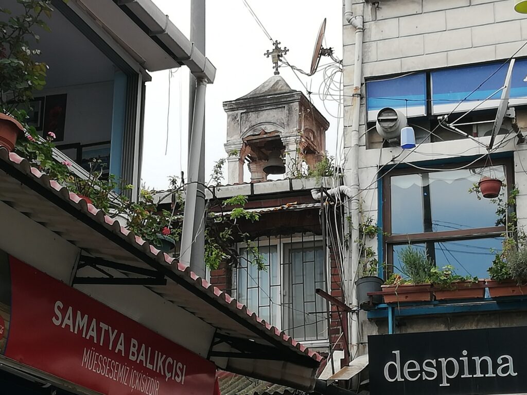 Org Abdurrahman Nazif Gürman Caddesinde uzun bir yürüyüşten sonra sağ tarafımızda Ermeni Katolik Kilisesinin sadece kapısını görüyoruz. Kilisenin ismine duvarlarında yada kapı üzerinde rastlamıyoruz. Ancak internetten araştırdığımızda Ermeni Katolik Kilisesi olduğunu öğreniyoruz. Yani bir özel ismi var mı bilmiyorum. Araştırmamız sonucu isminin Anarad Hığutyun Ermeni Katolik Kilisesi olduğunu öğreniyoruz. “Kilise 19. yüzyıl dini mimarisinin İstanbul’daki örneklerinden biridir. Temelleri 1856 yılında atılan neoklasik üsluptaki kagir kilisenin mimarı Andon Tülbentciyan’dır. Kilise, 1957, 1992 ve 1999 depremi sonrasında onarımlar geçirmiştir”. İstanbul’daki gördüğüm kiliseler içerisinde ilk kez Katolik Kilisesine rastlıyoruz. Kilise, yolun üst kısmında olduğundan duvarları cadde tarafından yüksek. Caddeden içteki yapılardan sadece kilisenin çanını ve çok az da çatısını görüyoruz. Kilisenin yanındaki tarihi yapı ise, bugün Özel Yüksek Öğrenim Yurdu olarak hizmet vermektedir. Biraz daha ilerledikten sonra solumuzda Yunus Emre Ortaokulunu görüyoruz. Caddenin ismi tam bu noktada değişiyor ve İmrahor İlyas Bey Caddesi ismini alıyor. Bu kez İmrahor İlyas Bey Caddesinde ilerliyoruz. Ancak cadde daralıyor iyice. Uzakta yüksek ağaçlar, saat kulesi benzeri bir yapı gözüküyor. Merak ediyoruz. Adımlarımızı hızlandırıyoruz. Yakınına vardığımızda güzel estetik bir çan kulesi görüyoruz. Kule üç katlı. Alt kısım aynı zamanda kemer şeklinde kapı girişi. Hemen üstü sunta / osb ile çevrilmiş. Restore mi ediliyor. Yoksa yukarıdan parçalar mı dökülüyor bilinmez. Ancak kötü bir görüntü verdiği muhakkak. Beyaz Sütun ve kemerler arasında bordo renk güzel bir uyum sağlamış. Kapalı olduğu için içeriye giremedik. Çan kulesinin hemen caddenin kenarında olduğu bu yapı Aya Konstantino Rum Ortodoks Kilisesidir.