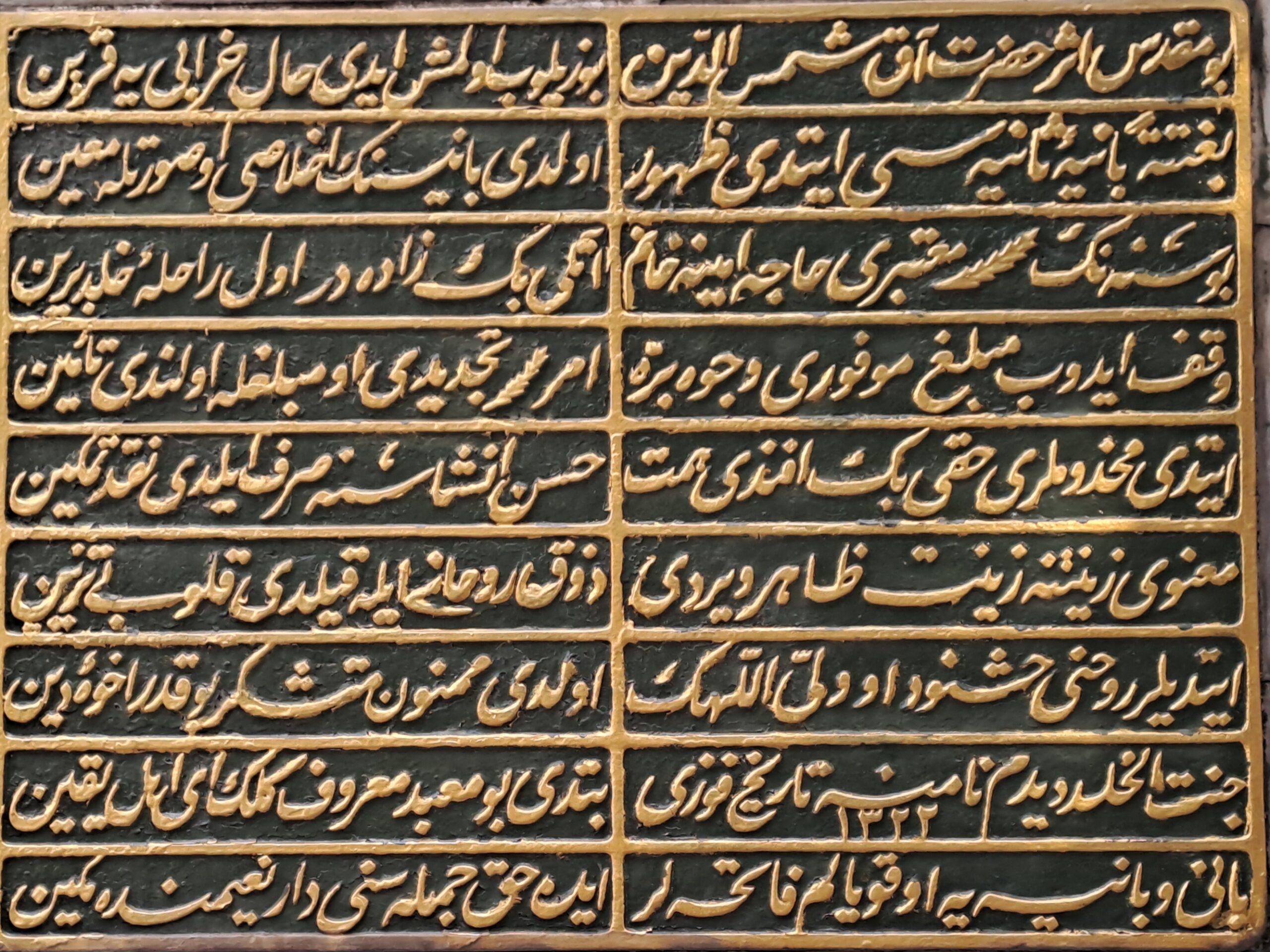 | Akşemseddin Camii Onarım Kitabesi H. 1322 / M. 1904-05 9 satır – 2 sütun 1 Bu mukaddes eser-i Hazret-i Akşemseddîn Bozulup olmuş idi hâl-i harâbîye karîn 2 Bağtaten bâniyye-i sâniyyesi etti zuhûr Oldu bânisinin ihlâsı o suretle muʻîn 3 Bosnanın muʻteberi Hâce Âmîne Hanım Atlı beyzâdedir ol râhile-i huld-i berîn 4 Vakf edip meblağ-ı mevfûru vücûh-i berre Emr-i tecdîdi o meblağla olundu teʻmîn 5 Etti mahdûmları Hakkı Beyefendi himmet Hüsn-i inşâsına sarf eyledi nakd-i temkîn 6 Maʻnevî zînetine zînet-i zâhir verdi Zevk-i rûhânî ile kıldı kulûbu tezyîn 7 Ettiler rûhunu hoşnûd o veliyullâhın Oldu memnûn müteşekkir bu kadar uhve-i dîn 8 “Cennetü’l-huld” dedim nâmına târîh Fevzî Bitti bu maʻbed-i maʻrûf gelin ey ehl-i yakîn 9 Bâni vü bâniyeye okuyalım Fâtihalar Ede Hak cümlesini dâr-ı naʻîminde mekîn H. 1322 1 Akşemsettin Hazretleri’nin bu mukaddes eseri bozularak yıkılmaya yüz tutmuştu. 2 Aniden ikinci yaptıranı (tamir ettireni) ortaya çıkınca ilk yaptıranın ihlâsı yardıma koştu. 3 Bosna’nın muteber kişilerinden cennet bineğinin atlı beyzadesi Hace Amine Hanım, yeryüzüne bol paralar vakfederek caminin yenilenmesi emri bu paralarla yerine getirildi. 4 Oğlu Hakkı Bey gayret ederek güzel bir şekilde yapımı için para harcadı. 5 Görünür güzellik ile manevi süsüne süs kattı, ruhani bir zevk ile kalpleri süsledi. 6 O Allah dostunun ruhunu hoşnut ettiler, bunca din kardeşi memnun ve müteşekkir oldular. 7 Ey Fevzi, tarih olarak sonsuz cennet dedim: 8 “Ey Allah dostları, ilim sahipleri gelin; bu meşhur caminin yapımı tamamlandı. 9 “Yaptıranlara (Hace Amine Hanım ve Hakkı Bey) Allah, cümlesini cennetine yerleştirsin diye Fatihalar okuyalım. (Kaynak: Kitabelerin Kitabı Fatih (E.T: 18.6.2023) |