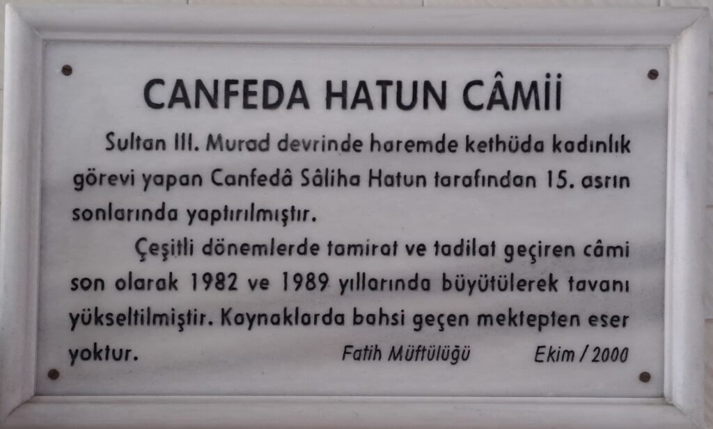 Tekkeye bitişik, bir girişi Canfeda Camii Aralığı Sokağından olan Canfeda Hatun Camine ilerliyoruz. Caminin ana girişi Canfeda Camii Sokağından yapılıyor. Cami avlu kapısı girişinde sağ tarafta prizma panodan cami hakkında bilgi ediniyoruz: “Canfeda Hatun Camii, Kahya Kadın veya Kethüda Kadın isimleri ile de bilinen Sultan I. Ahmed’in Harem Kethüdası Canfedâ Saliha Hatun tarafından 1584 yılında yaptırılmıştır. III. Murad zamanında kabiliyeti ve iyi huyu sayesinde ön plana çıkarak, Nurbânu Valide Sultan’ın en gözde cariyesi ve sağ kolu haline gelen Canfeda Hatun, Topkapı Sarayı Harem dairesinde en yüksek mevki olan kethüda (kâhya) kadınlık görevine getirilerek bütün haseki ve cariyelerin sorumlusu ve idarecisi olmuştur. Yaşamının son günlerinde ise kendini hayır işlerine adayarak Karagümrük’te harap durumda olan mescidi ihya etmiş ve yerine Canfeda Hatun Camii’ni yaptırmıştır. Zaman içerisinde geçirdiği pek çok onarım ve tamiratlarla günümüze kadar ulaşmış olan caminin 20.yüzyılın sonlarında geçirdiği onarımlarda minaresi yıkılarak beden duvarları yükseltilmiştir. İstanbul’da farklı yerlerde hayratı olan Canfeda Saliha Hatun’un mezarı Eyüp Sultan ilçesinde bulunmaktadır.” Cami dıştan ytong tuğla görünümlü, minaresi yukarıda belirtildiği gibi yeni bir yapı. Cami içerisinde tavanda süsleme bulunmamaktadır. Caminin orta kısmından başlayarak mihraba kadar bir kat yüksekliğinde çinilerle kaplanmış.