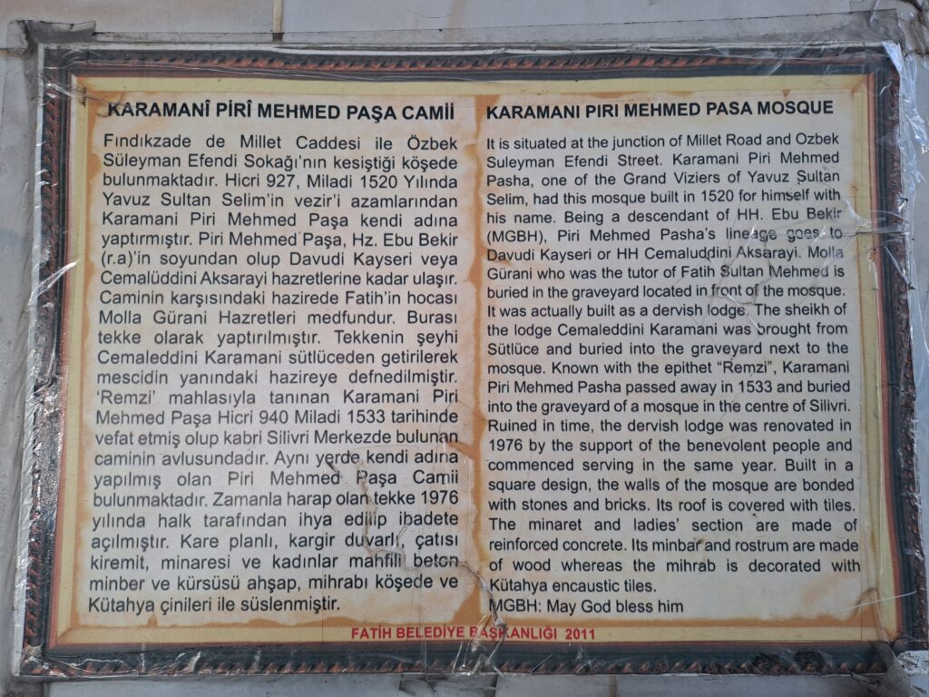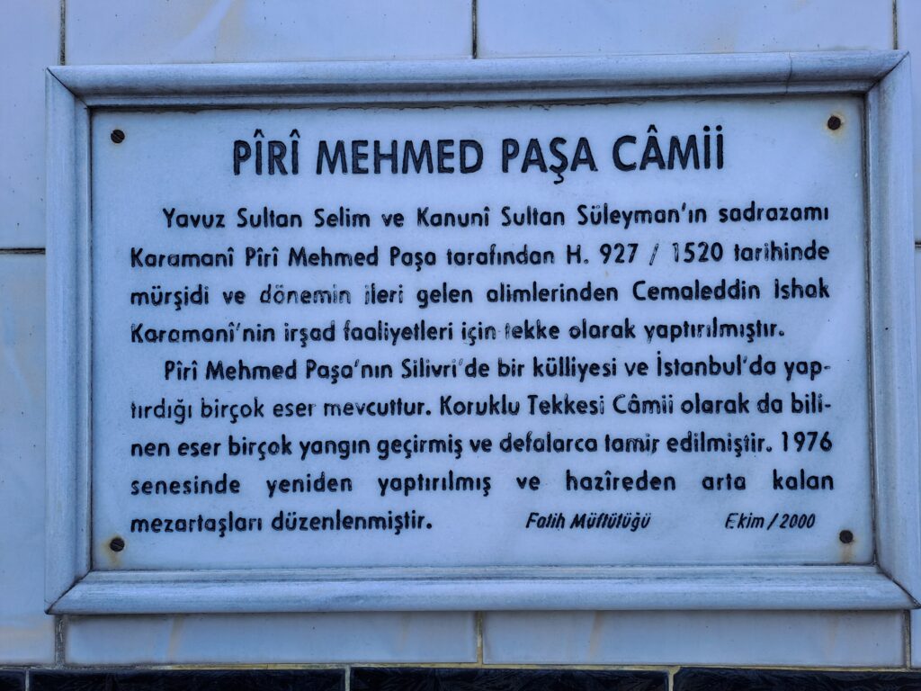 Fatih Belediyesine ait tabelada ise yukarıda yazılanlardan farklı olarak; “…. Piri Mehmed Paşa, Hz. Ebu Bekir (r.a) soyundan olup Davudi Kayseri veya Camalüddini Aksarayi Hazretleri’ne kadar ulaşır. Caminin karşısındaki hazirede Fatih’in hocası Molla Gürani Hazretleri (Şemseddin Ahmed Gürani ) medfundur. Tekke şeyhi Cemaleddini Karamani Sütlüce’den getirilerek mescidin yanındaki hazireye defnedilmiştir. ‘Remzi’ mahlasıyla tanınan Karamani Pîrî Mehmed Paşa, Hicri 940 Miladi 1533 tarihinde vefat etmiş olup kabri Silivri merkezde bulunan caminin avlusundadır. Aynı yerde kendi adına yapılmış olan Piri Mehmed Paşa Camii bulunmaktadır. Zamanla harap olan tekke 1976 yılında halk tarafından ihya edilip ibadete açılmıştır….”