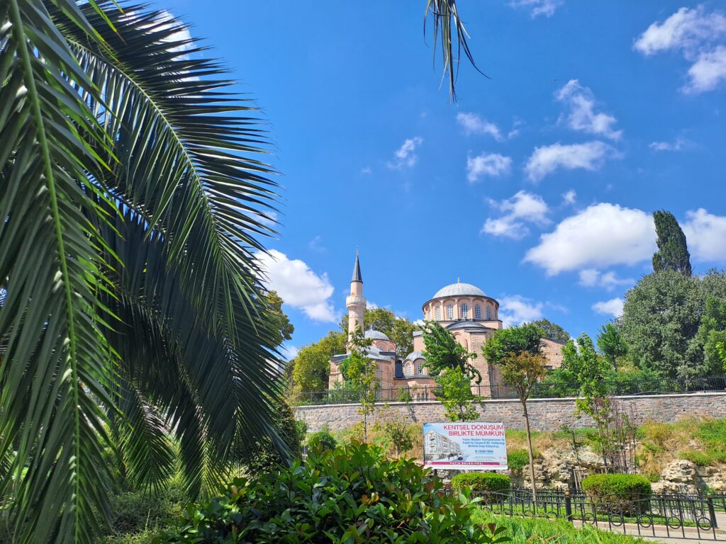 Kariye Camiinden çıkışta Mustafa Ağa Çeşmesini fotoğraflayıp, Kariye Camii Sokakta devam ediyoruz. 2021 yılında caminin etrafı restorasyon nedeniyle sarılıyken çektiğim noktadan bu kez restore edilmiş halini çekiyorum. Kariye Şehir Parkından Kariye Camii güzel gözüküyor.
