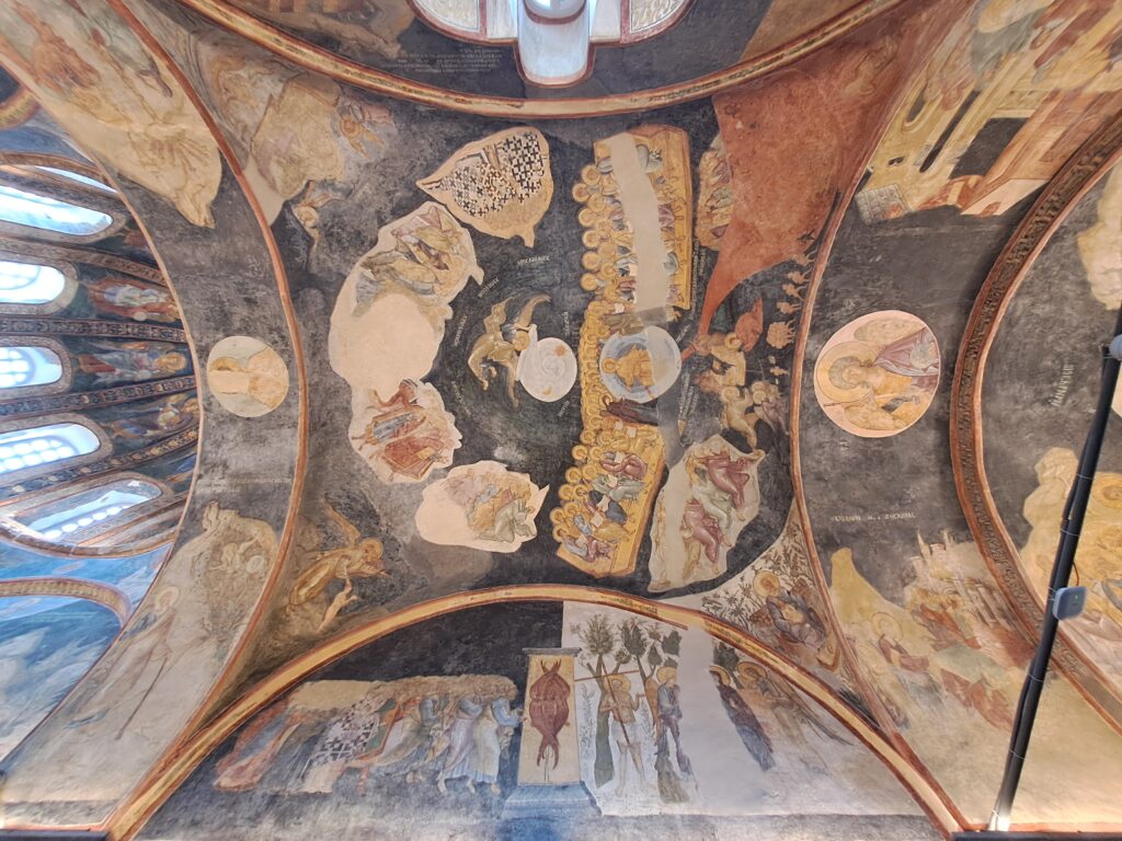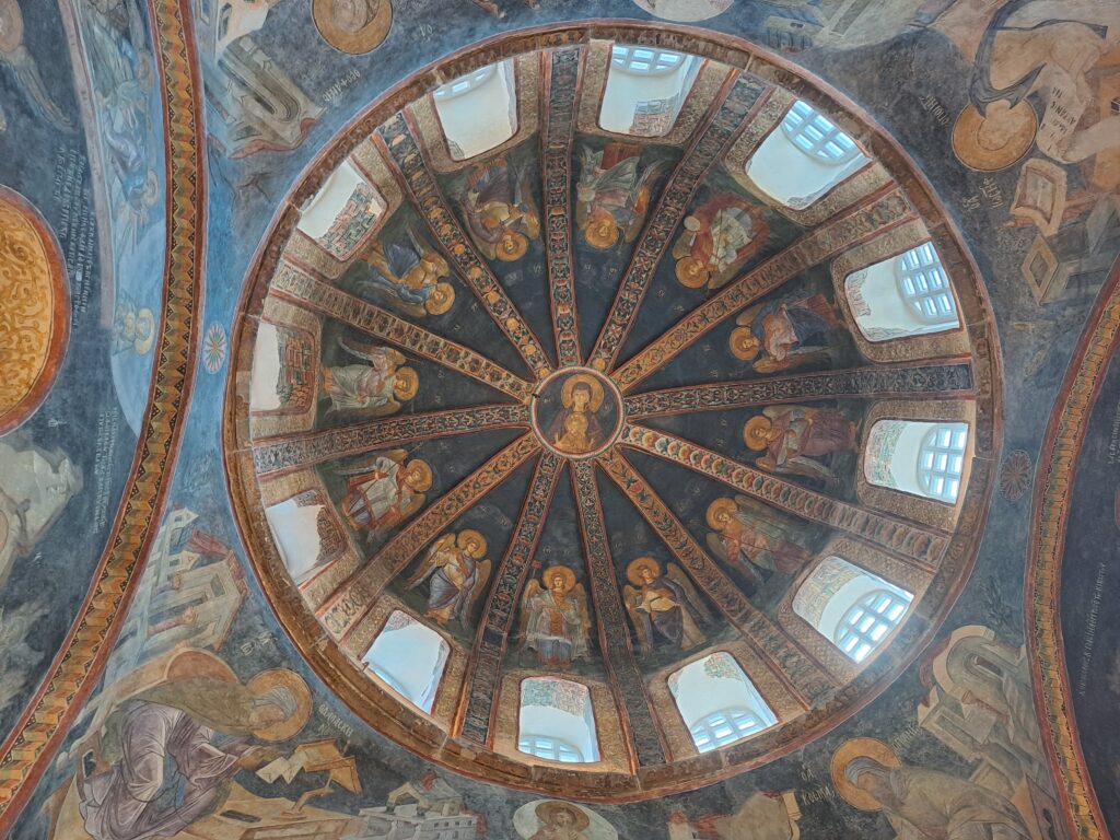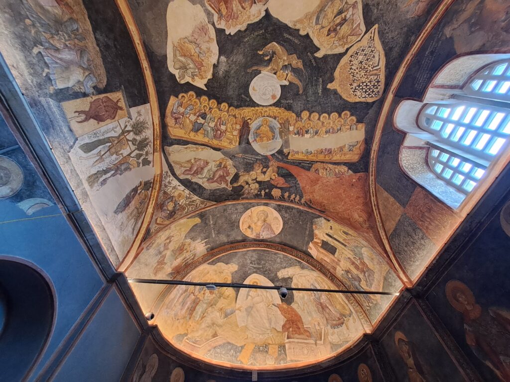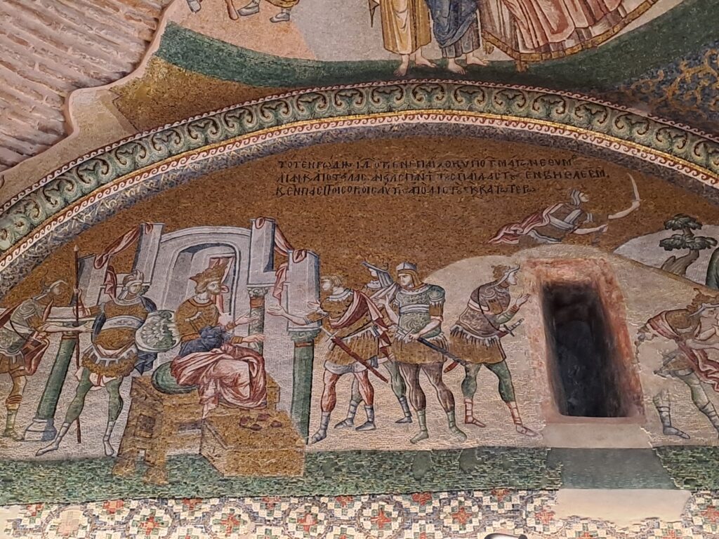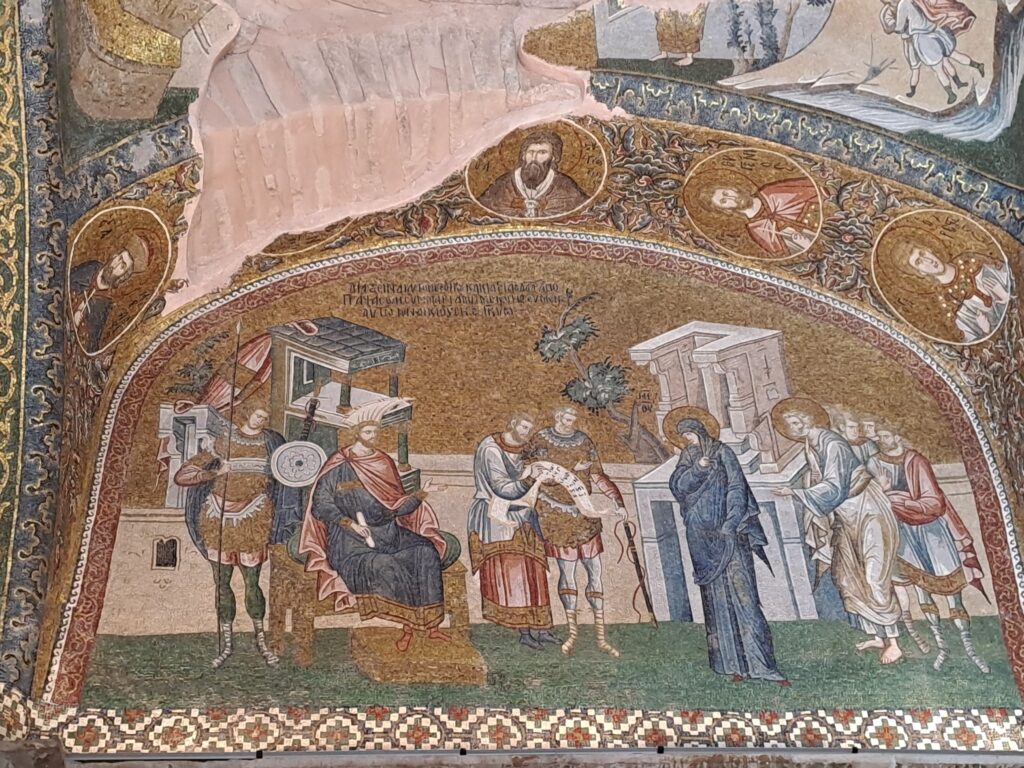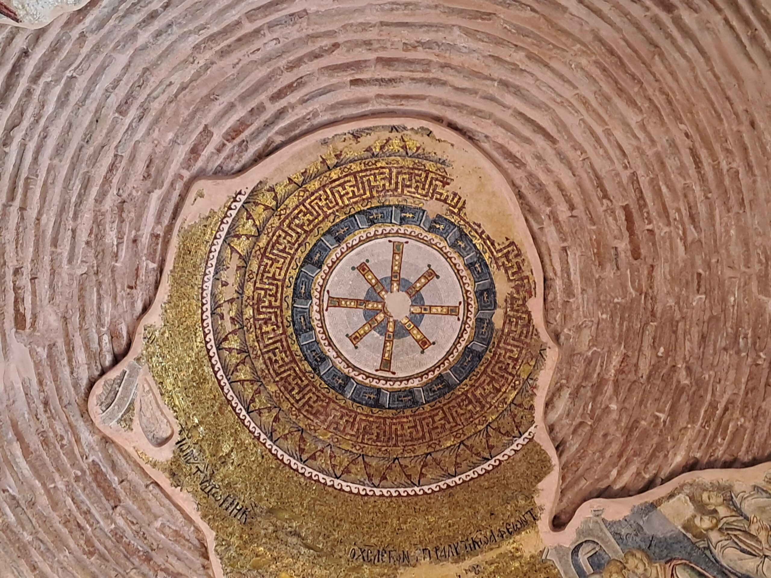 - Naosta üç mozaik panel yer alır. Bunlardan biri batı duvarında, ana kapı üzerinde bulunan Meryem’in Ölümü’dür (Koimesis). Diğer ikisi ise, bemanın iki tarafındaki templon panelleridir. ↩︎