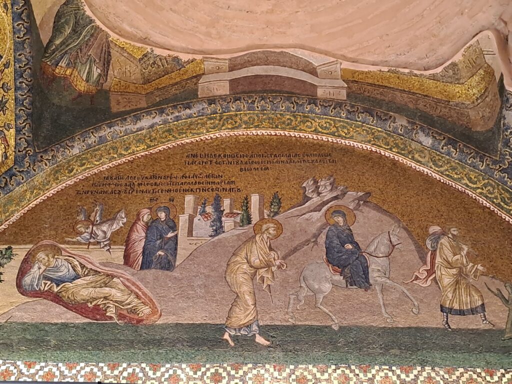 - İç narteksin kuzey duvarında Hz. Meryem’in doğumundan evliliğine kadar olayları gösteren tasvirler yer alır. ↩︎