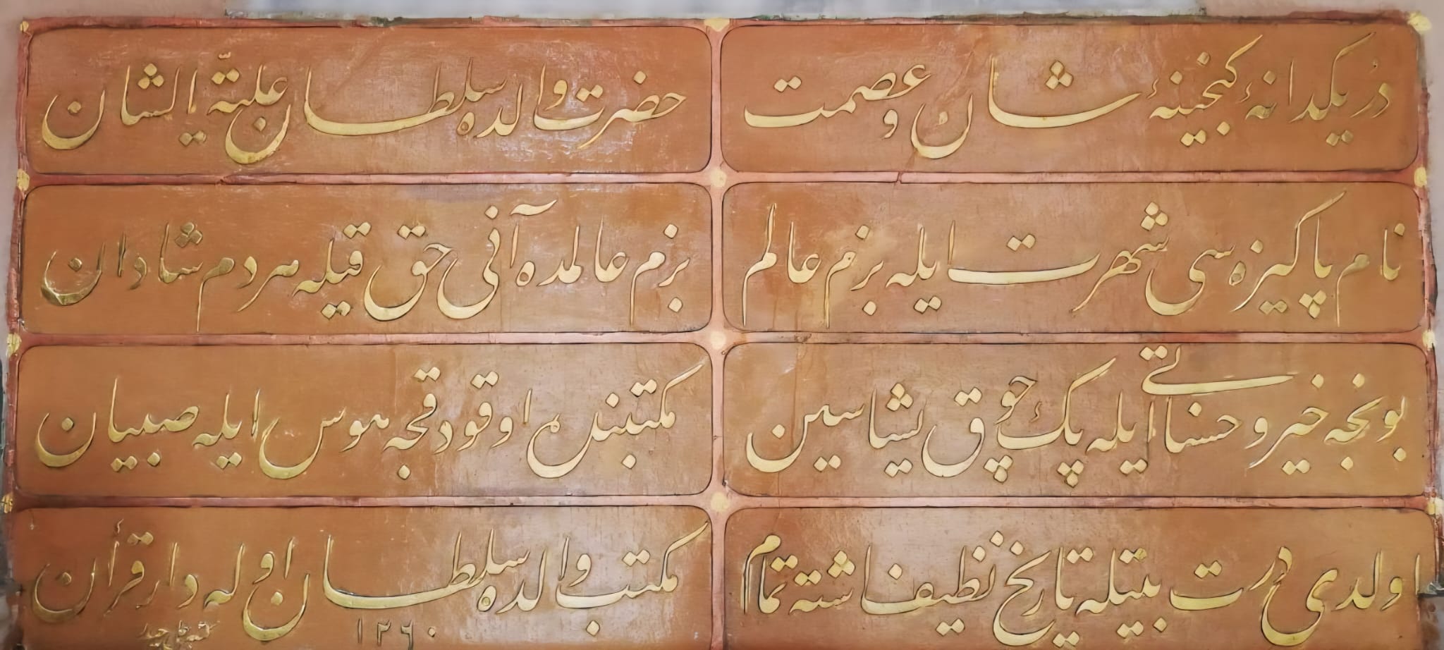 | Valide Sultan Mektebi Kitabesi 4 satır – 2 sütun (Molla Aşki Camiinde bulunuyor) 1 Dürr-i yekdâne gencine-i şân ü ismet Hazret-i Valide Sultan-ı âliyyetü’ş-şân 2 Nâm-ı pakizesi şöhret ile Bezm-i Âlem Bezm-i âlemde anı Hakk kıla her dem şadân 3 Bunca hayr ü hasenatı ile pek çok yaşasın Mektebinde okudukça heves ile sıbyân 4 Oldu dört beytile tarih-i latif işte tamam “Mekteb-i Valide Sultan ola dâr-ı Kur’ân” H. 1260 / M. 1844 (Kaynak: Kitabelerin Kitabı Fatih (E.T: 5.9.2025) |