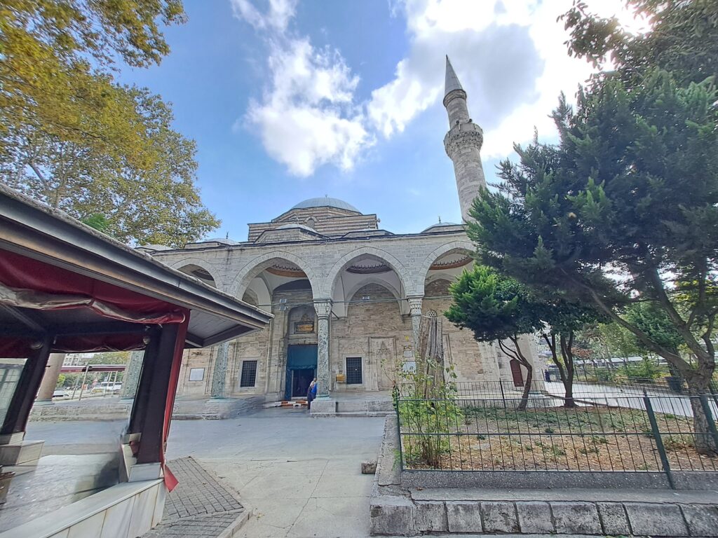 Caminin avlusunda caminin iki tarafını çevreleyecek kadar bir çok kabir bulunuyor. Avluda ise iki mermer kabir kubbeli yapı altında bulunuyor. Cami duvarındaki mermer tabeladan okuduğumuza göre yanları açık bu türbe, Şirmerd Çavuş Türbesi. Kabirlerden birisi Şimerd Çavuş’a diğeri ise kızı Kamerşah Hatun’a aittir. Caminin avlusunda yer alan bu yapının / çeşmenin adı araştırdığım kadarıyla “Oğlanlar Tekkesi”. Tekke, Türbe, Sebil ve Çeşmeden oluşuyor. Araştırmalarımızda Sebilin adının Mehveş Hanım Sebili olarak ta anıldığı görülmüştür. Bu sebil Aksaray Murad Paşa Cami avlusundadır. Eski yerinden kaldırılıp buraya kurulurken kitabe taşları oldukça zarar görmüş, kırılıp kaybolmuştur.
