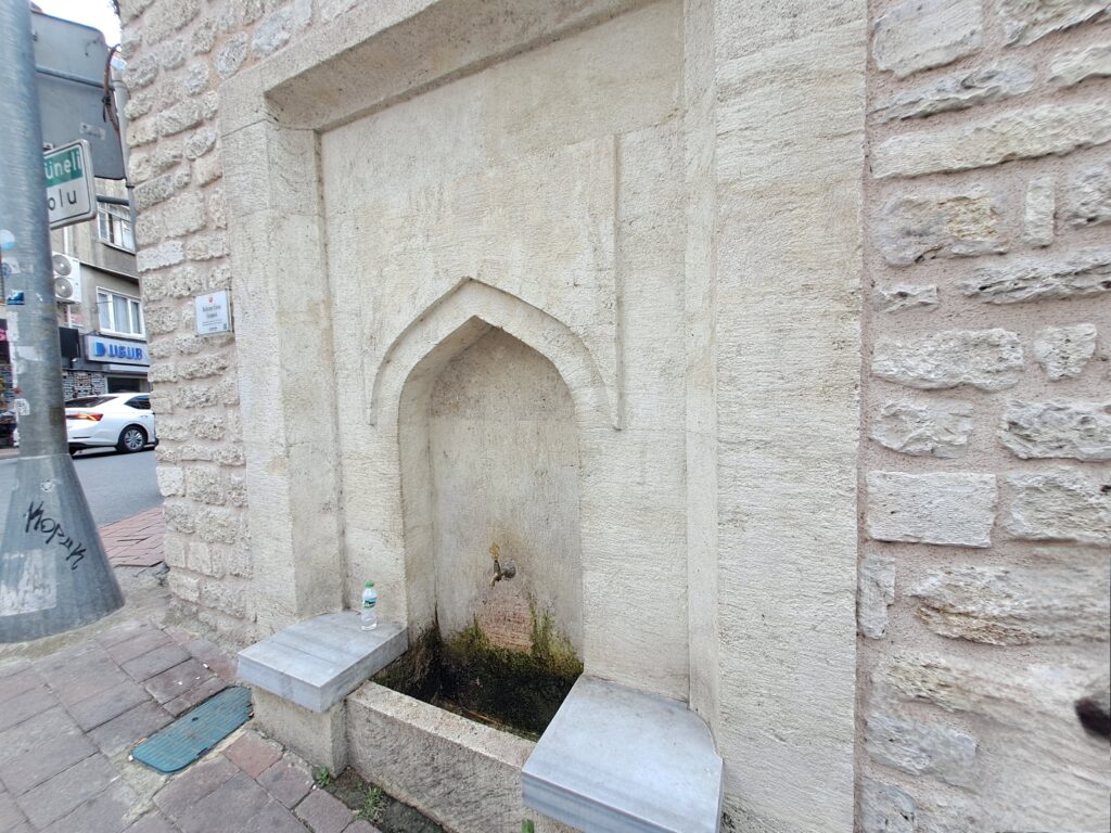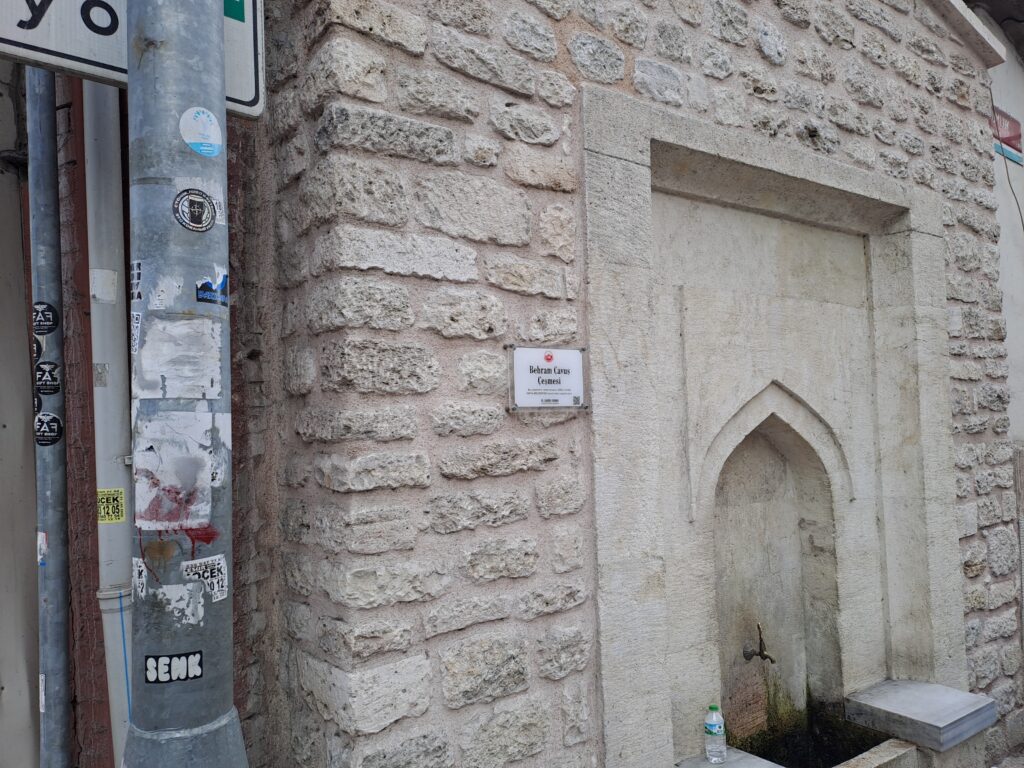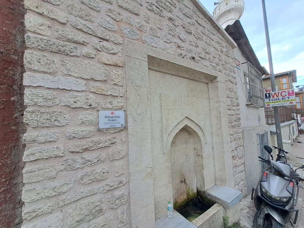 1 Ekim 2025 Çarşamba günü bölgeden geçerken öğle namazı Behram Çavuş Camiine denk geldik. Namazı eda ettikten çıkışta sağ köşede Fatih Belediyesi tarafından restore edilen Behram Çavuş Camii Çeşmesi görüyoruz.