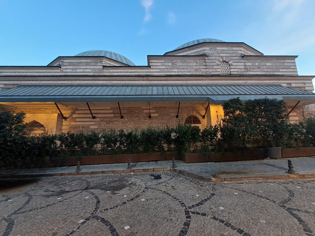 Bugün üçüncü kez İtfaiye Caddesine çıkıyoruz. Sağ yanımızda sonradan hamam olduğunu öğrendiğimiz Barbaros Hayrettin Paşa Çinili Hamamını görüyoruz. Hamam çinileriyle ünlü olup, Mimar Sinan’ın İstanbul’da yaptığı ilk ve en büyük hamamdır. Araştırmalarımızda, “Çinili Hamam’ın 1540-1546 yılları arasında Barbaros Hayreddin Paşa tarafından Mimar Sinan’a yaptırılarak Beşiktaş’taki bugün mevcut olmayan medresesine vakfedildiğini öğreniyoruz. Bânisine izâfetle Hayreddin Paşa veya Kaptanpaşa Hamamı, içinde ve yakınında bulunduğu semtlere göre de Tezgâhçılar veya Zeyrek Çinili Hamamı adlarıyla da tanınmaktadır.” Ayrıntılı bilgi için Diyanet İslam Ansiklopedisinin ÇİNİLİ HAMAM maddesine bakılabilir. Haber kaynaklarından 12 yıl aradan sonra restorasyonu biten hamamın açıldığını okuyoruz (10 Kasım 2022). Hamam yol seviyesinin altında kalmış.