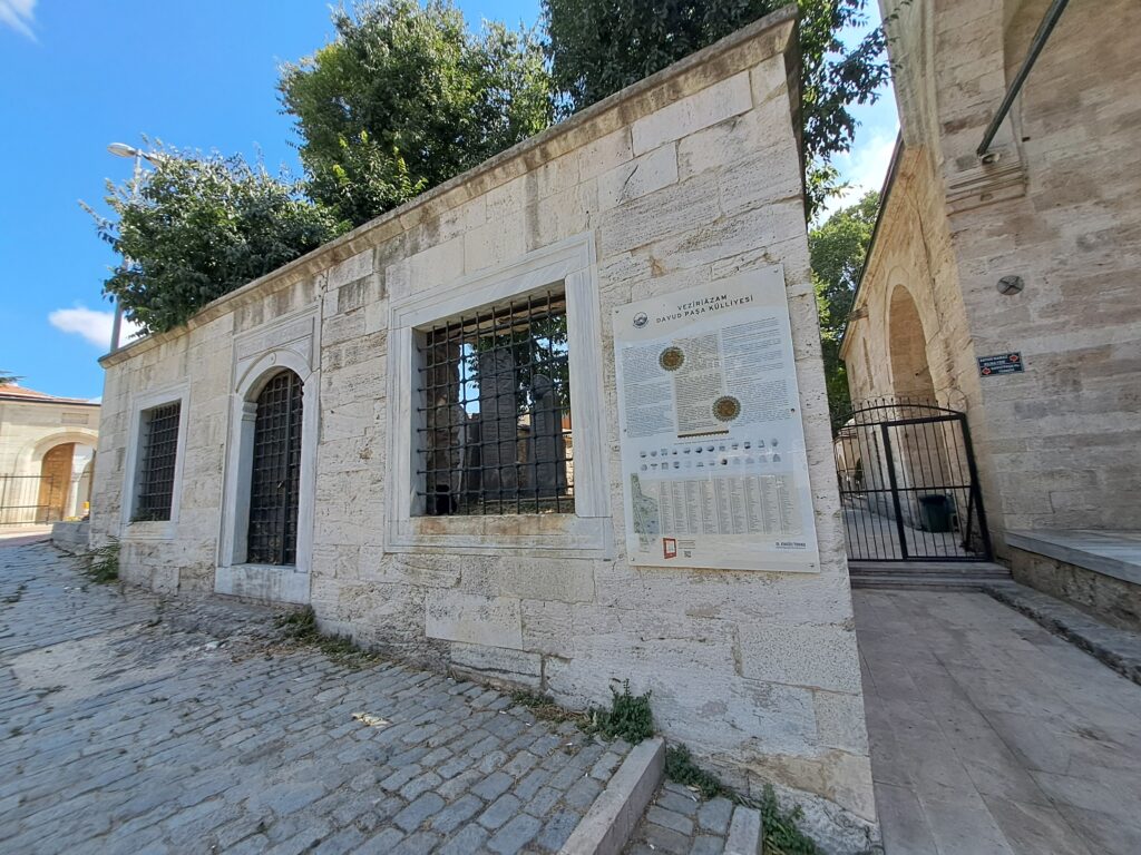 Davutpaşa Külliyesi, arasından yol geçen iki ayrı parça halinde bulunuyor. Caminin bulunduğu bölümün etrafı açık. Camiye ait hazire, türbe, çocuk oyun parkı, yüzü Hekimoğlu Ali Paşa Caddesine bakan bir çeşme yer alıyor. Avluda bir kaç fotoğraf çektikten sonra prizma tabeladan cami ve külliyenin tarihçesi hakkında bilgi ediniyoruz: “Külliye; cami, medrese, sıbyan mektebi, tabhane, çifte hamam, imaret ve çeşmeden müteşekkildir. II. Beyazıt’ın veziri “Koca Davut Paşa” tarafından 1485’de yaptırılmıştır.
