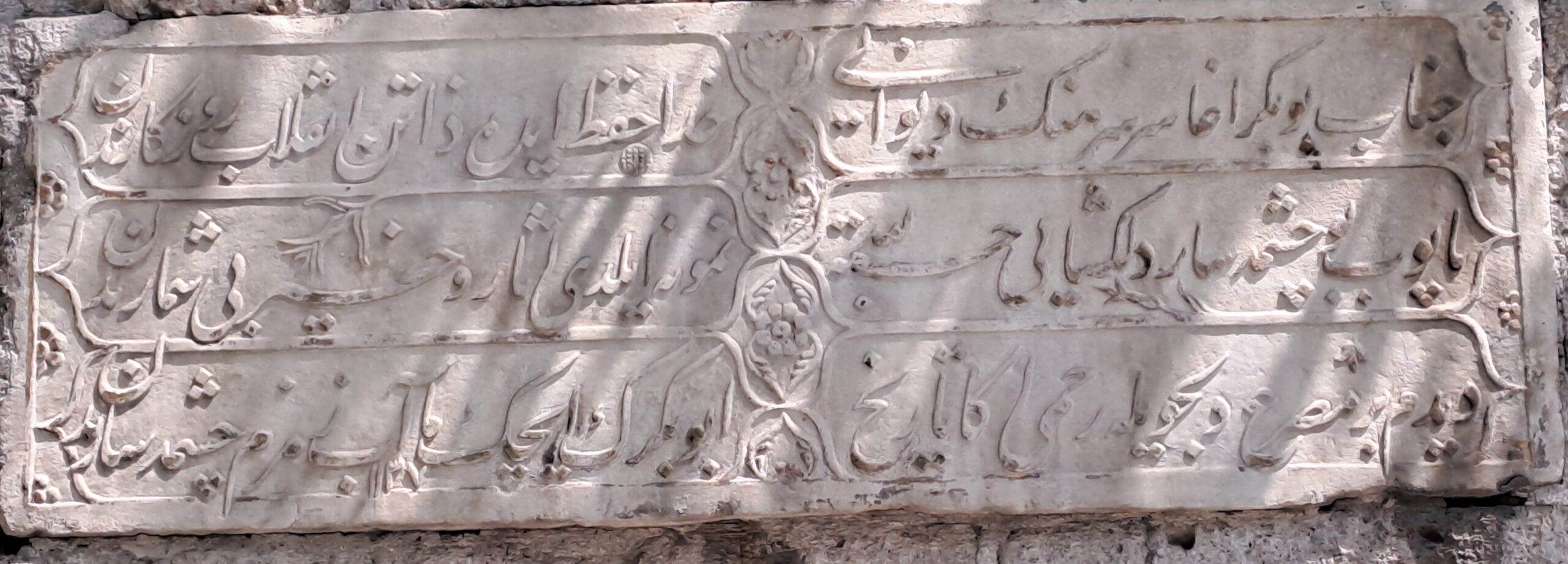 | Ebubekir Paşa Çeşmesi Kitabesi 3 satır – 2 sütun 1 Cenâb-ı bû Bekîr Ağa ser-i serheng-i dîvânî Hudâ hıfz ede zâtın inkılâb-ı rûzigârından 2 Yapıp bu çeşme-sâr-ı dil-güşâyı hasbetenlillâh Numûne eyledi âsâr u hayr-ı bî-şümârından 3 Dedim bir mısrâ-ı dil-cû ile Rahmî ona târîh Ebûbekir’in için mâ’âb-ı Zemzem çeşme-sârından |