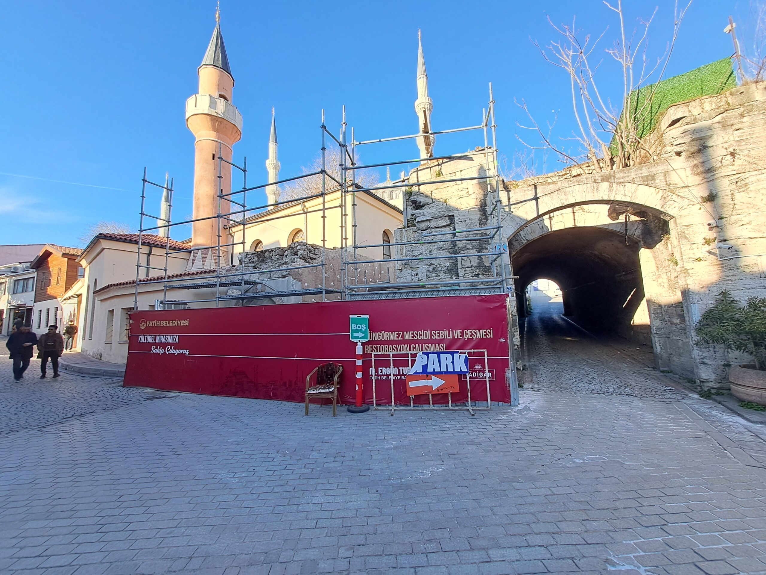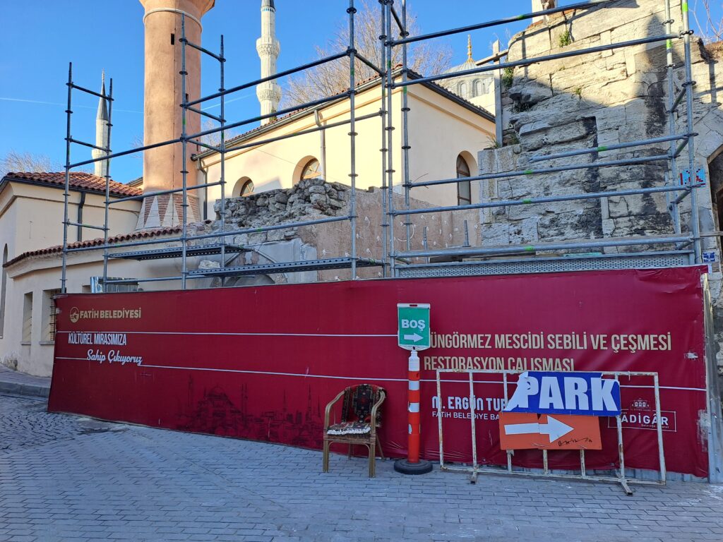 Tavukhane Sokağına giriyoruz. Biraz ilerledikten sonra sağ tarafımızda Sultan Ahmet Suphi Paşa MTA Lisesinin önünden geçiyoruz. Okul bahçesinin bitiminde, solda köşede onarımı devam eden tarihimize yeniden kazandırılan bir cami görüyoruz. Araştırmalarımızda caminin çok eskiden çekilmiş fotoğrafına rastlıyoruz. Daha sonra zamanla harabe haline gelmiş. Tekrar ayağa kaldırılıyor Güngörmez Mescidi. Diğer adı Kağnı Mescididir. Mescid 1465 yılında Fatih Sultan Mehmed’in Kağnıcıbaşı tarafından yaptırılmıştır. Eski fotoğraflarda caminin hemen yanında iki adet çeşme ve iki bu çeşme arasında bir sebil göze çarpıyor. Çeşme ve sebilin mescidin adıyla anıldığını düşünerek Güngörmez Çeşmesi ve Sebili diyoruz. (Bazı kaynaklarda Sultan Ahmet Külliyesi Sebil ve Çeşmesi-4 diye isimlendirilmiş) Etrafı çevreli olduğundan çeşmeleri göremedik. Ancak eski fotoğraflar ve Google Earth’da gözüküyordu. Eski dememe bakmayın restorasyona başlayalı en fazla 2 yıl olmuştur. Onarılan cami ile Sultan Ahmet Camii minareleri güzel bir görüntü oluşturuyor. Caminin hemen yanında uzunca bir taş geçit bulunuyor. Geçidin önünde otopark tabelasından yolun sonunun otoparka açıldığını anlıyoruz. Geçit, Sultan Ahmet Külliyesi Tonozlu Geçit olarak anılıyor. 11 Nisan 2024 Perşembe günü Ramazan Bayramının 2.günü bölgeye yaptığımız ziyarette mescidin yapımının bittiğini, çeşmenin önünün açıldığını gördük. Mescid kapalı idi. Avlu penceresinden avluyu fotoğrafladık.