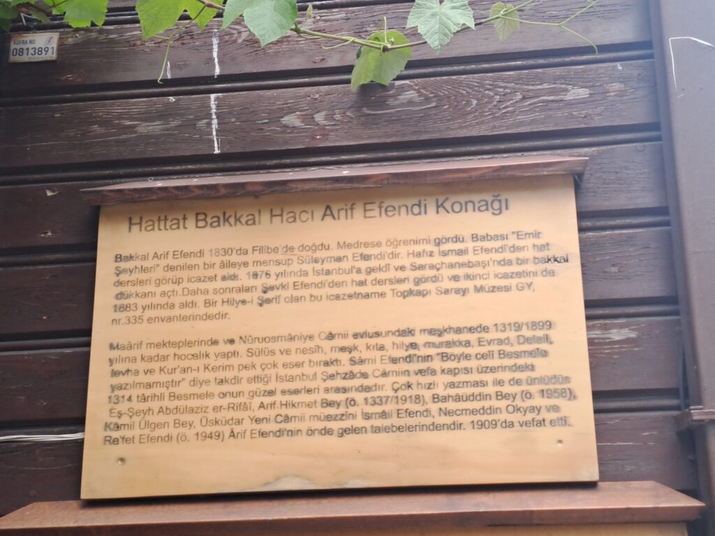 22 Mayıs 2025 günü İskenderpaşa, Yeşil Tekke Sokaktan geçerken daha önce gördüğüm, ancak dikkat etmediğim bir ayrıntıyı görerek yazıya döküyorum. Halen bir STK’mızın kullandığı ahşap görünümlü yapının Hattat Bakkal Hacı Arif Efendi Konağı olduğunu öğreniyoruz. STK girişindeki tabelada Konak ve sahibi hakkında şunları okuyoruz: “Bakkal Hacı Arif Efendi 1830’da Filibe’de doğdu. Medrese öğrenimini gördü. Babası “Emir Şeyhleri” denilen bir aileye Süleyman Efendidir. Hafız İsmail Efendi’den hat dersleri görüp icazet aldı.1876 yılında İstanbul’a geldi ve Saraçhanebaşı’nda bir bakkal dükkanı açtı. Daha sonraları Şevki Efendi’den hat dersleri gördü ve ikinci icazetini de 1883 yılında aldı. Bir hilye-i Şerif olan bu icazetname Topkapı Sarayı Müzesi GY, nr.335 envanterindedir. Maarif mekteplerinde ve Nuruosmaniye Camii avlusundaki meşkhanede 1319/1899 yılına kadar hocalık yaptı. Sülüs ve nesih, meşk, kıta, hilye, murakka, Evrad, Delail, levha ve Kur’an-ı Kerim pek çok eser bıraktı. Sami Efendinin “Böyle celî Besmele yazılmamıştır” diye takdir ettiği İstanbul Şehzade Camiinin vefa kapısı üzerindeki 1314 tarihli Besmele onun güzel eserleri arasındadır. Çok hızlı yazması ile de ünlüdür. Eş-Şeyh Abdülaziz er-Rıfâi, Arif Hikmet Bey (ö. 1337/1918), Bahâuddin Bey (ö. 1958), Kamil Ülgen Bey, Üsküdar Yeni Camii müezzini İsmail Efendi, Necmeddin Okyay ve Refet Efendi (ö. 1949) Arif Efendi’nin önde gelen talebelerindendir. 1909’da vefat etti.”