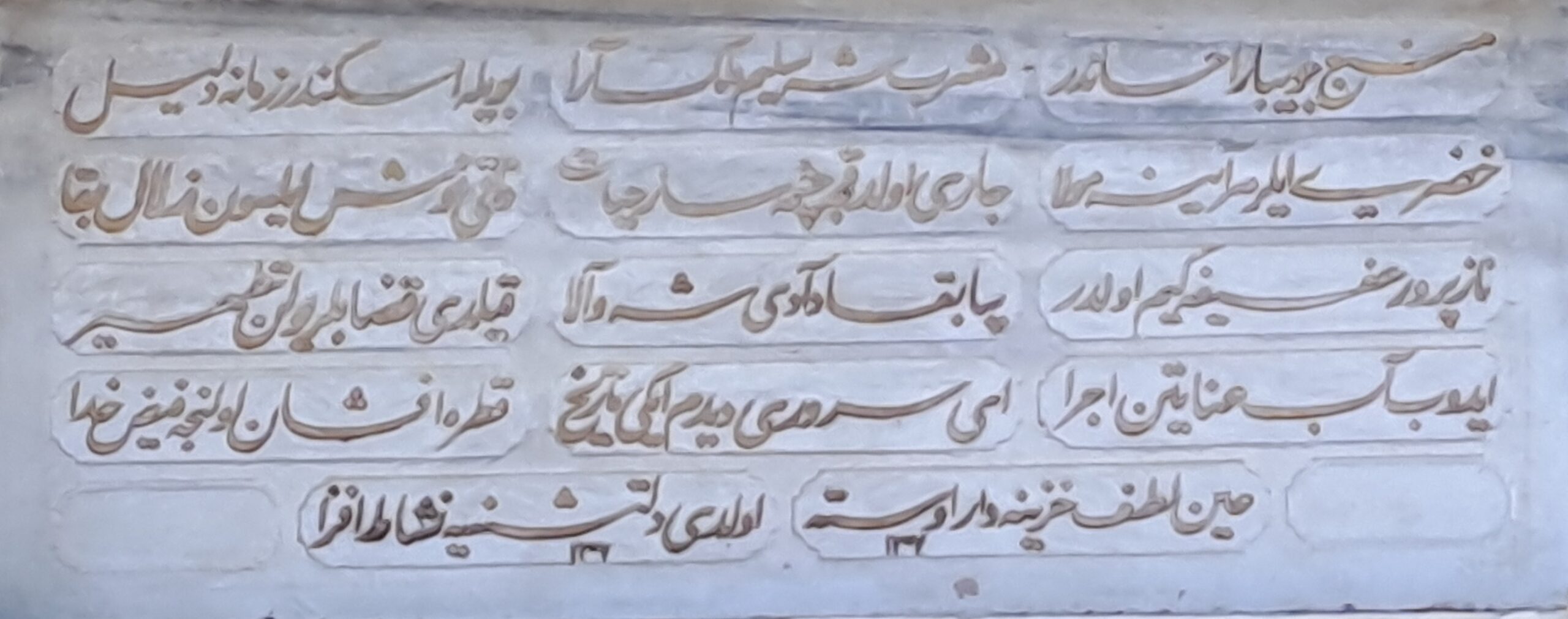 | Hazinedar Usta Çeşmesi Kitabesi; 5 satır, ilk dördünde 3 sütun, son satırında 2 sütun 1 Menbaʽ-ı cûy-bâr-ı ihsândır Meşreb-i şeh Selîm-i mülk-ârâ 2 Böyle İskender-i zamâna delîl Hızrı eyler murâdına Mevlâ 3 Cârî oldukça çeşme-sâr-ı hayât Zatı nûş eylesin zülâl-i bekâ 4 Nâz-perver Afîfe kim oldur Sâbıkâ dâdı-yı şeh-i vâlâ 5 Kıldı Kassâblar yolun tathîr Edip âb-ı inâyetin icrâ 6 Ey Sürûrî dedim iki târîh Katre-efşân olunca feyz-i Hudâ 7 Ayn-ı lutf-ı Hazînedâr Usta Oldu dil-teşneye neşât-efzâ Kaynak: kulturenvanteri.com/ (E.T.:1.1.2022) |