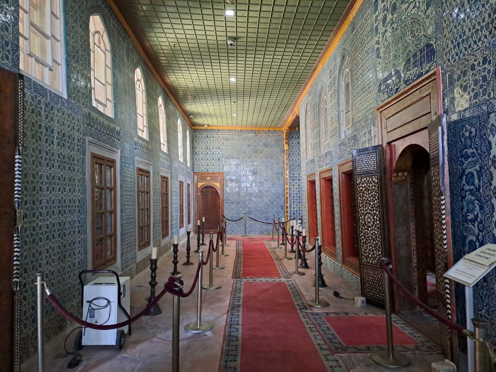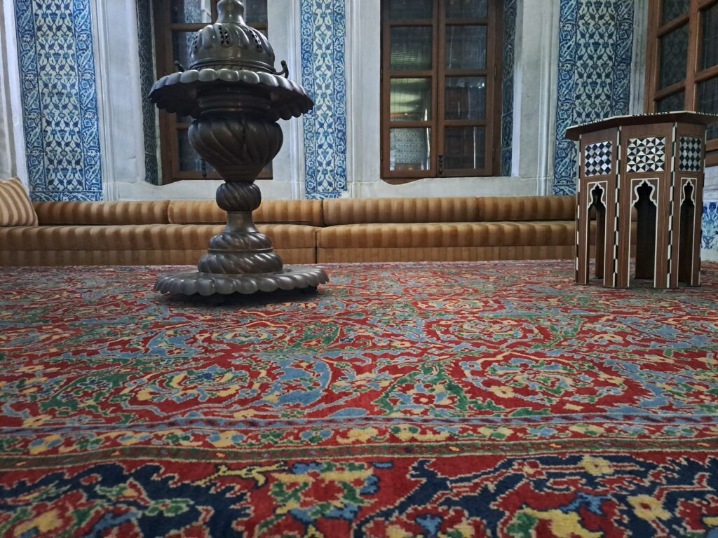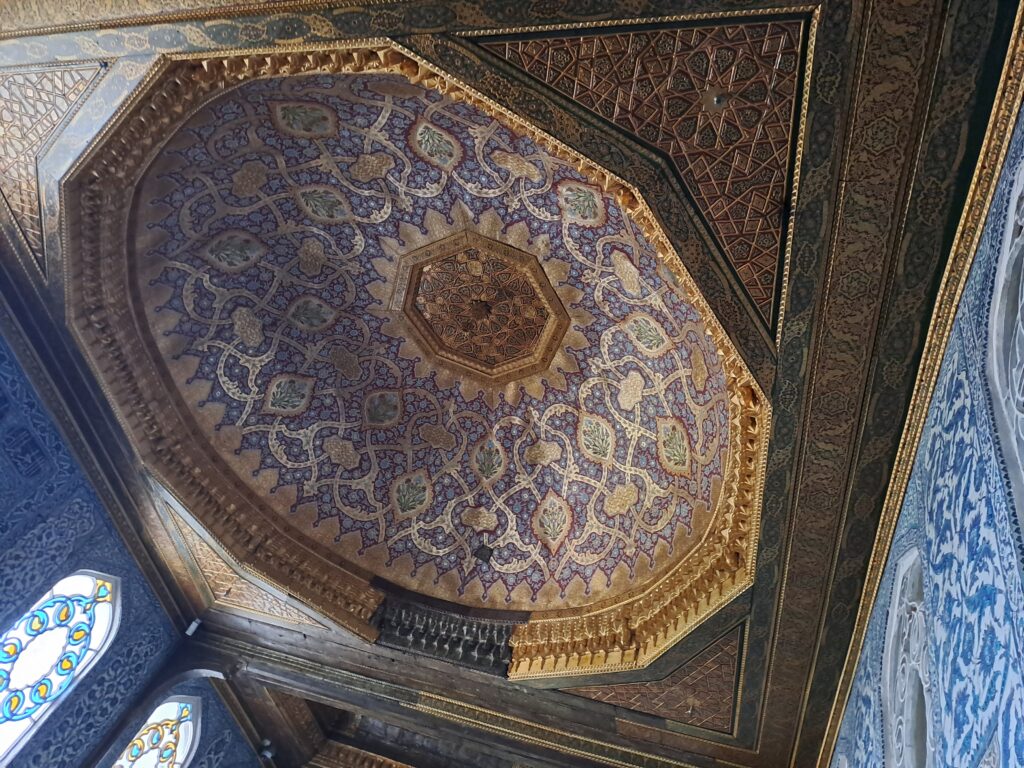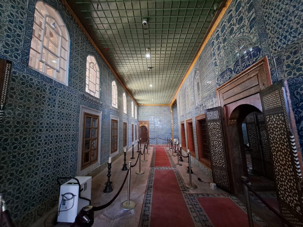 15 Ağustos 2025 tarihinde Hünkar Kasrında yine sergiyle karşılaşıyoruz: “Mirasımızın Altın İzleri Tezhip ve Minyatür Sergisi”. Sergi, 14-31 Ağustos tarihleri arasında gezilebiliyor. Bu kez içeri girmeye karar veriyoruz. Yokuş yukarı, sağlı sollu sergi materyalleri yer alıyor. İnceleyerek yukarı çıkıyoruz. Hala içeride saklı bir hazine olduğunun farkında değiliz. Sade bir biçimde koridordan geçip camiye ulaşacağımızı zannediyoruz. Ayakkabımıza galoş giyerek Hünkar Kasrına giriyoruz.
