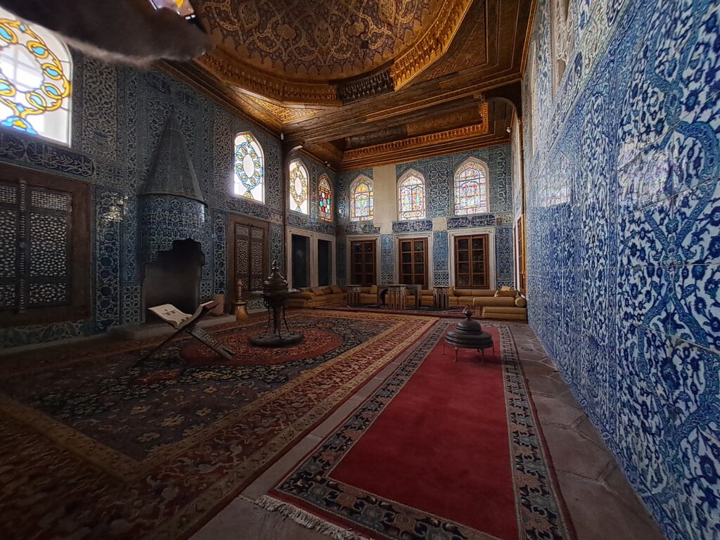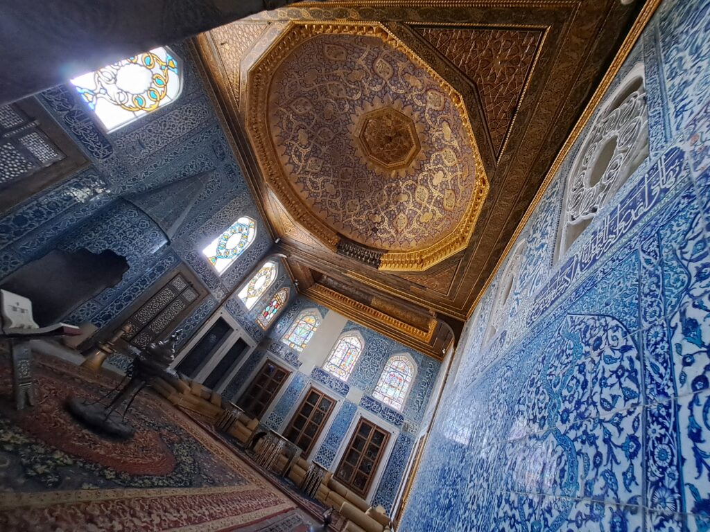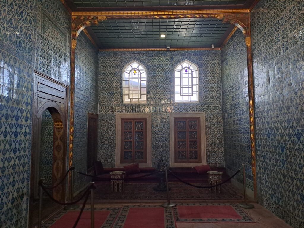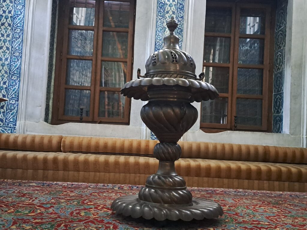 15 Ağustos 2025 tarihinde Hünkar Kasrında yine sergiyle karşılaşıyoruz: “Mirasımızın Altın İzleri Tezhip ve Minyatür Sergisi”. Sergi, 14-31 Ağustos tarihleri arasında gezilebiliyor. Bu kez içeri girmeye karar veriyoruz. Yokuş yukarı, sağlı sollu sergi materyalleri yer alıyor. İnceleyerek yukarı çıkıyoruz. Hala içeride saklı bir hazine olduğunun farkında değiliz. Sade bir biçimde koridordan geçip camiye ulaşacağımızı zannediyoruz. Ayakkabımıza galoş giyerek Hünkar Kasrına giriyoruz.