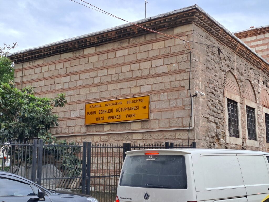 Camhanenin hemen yanında yine parkın içerisinde İBB’ye ait “Kadın Eserleri Kütüphanesi ve Bilgi Merkezi Vakfı” tabelalı tarihi binayı görüyoruz. Bahçesine girdik. Haftasonu kapalı olduğundan içeriye giremedik. Dışarıdan fotoğraf çekmekle yetindik. Binaya camhane’de olduğu gibi merdivenlerle inildikten, açık avlu gibi bir yerden geçtikten sonra giriş yapabiliyorsunuz. Binaların ilk hali de böyle miydi, yoksa zamanla doldurulduğu için bina cadde seviyesinin altında mı kaldı bilemiyorum. Bana 2.şık daha mantıklı geldi. Araştırmak gerek…