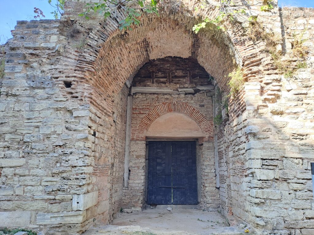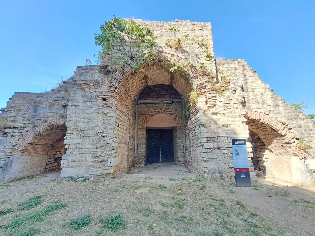 dan bazı seyyahlara göre altından kapı kanatları Latin işgalinde yağmalanarak yok edilmiştir. Seyyah ve doğabilimci P. Gyllius, İstanbul’un Tarihi Eserleri adlı eserinde kapıda yer alan mermerden iki sütunu ve bunları süsleyen kabartmaları ve revaklı yolu ayrıntılarıyla anlatır. Bu kabartmalardan birinde Parnassos Dağı resmedilmiş, kollarını kaldırmış Musaların Pegasus ile kavgaları anlatılmıştır. Bir diğeri Phaeton’un düşüşünü, bir diğeri cehennemlerin bekçisi olarak adlandırılan Cerbere’i götüren Herkül’ü, bir diğeri uyuyan Adonis’i ile ona yaklaşan Venüs’ü ve meşalesini vermek üzere olan Cupidon’u temsil ediyordu. Diğerleri de benzer mitolojik sahneler ihtiva etmekteydi