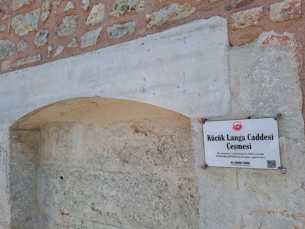 Cerrahpaşa Camii Sokaktan Küçük Langa Caddesine doğru yokuş aşağı iniyoruz. Tam karşıma çeşme olabileceğini tahmin ettiğim bir yapı çıkıyor. Şu ana kadar gördüklerimden farklı, sıva ile kaplanmış, sadece kemer benzeri kapı gibi bir yapı. Çeşme diye düşünüyorum. (Araştırmalarımızda buranın çeşme olduğunu öğreniyoruz. İsmini bulamadım bazı kayıtlarda not olarak Küçük Langa Caddesi Çeşmesi olarak geçiyor).