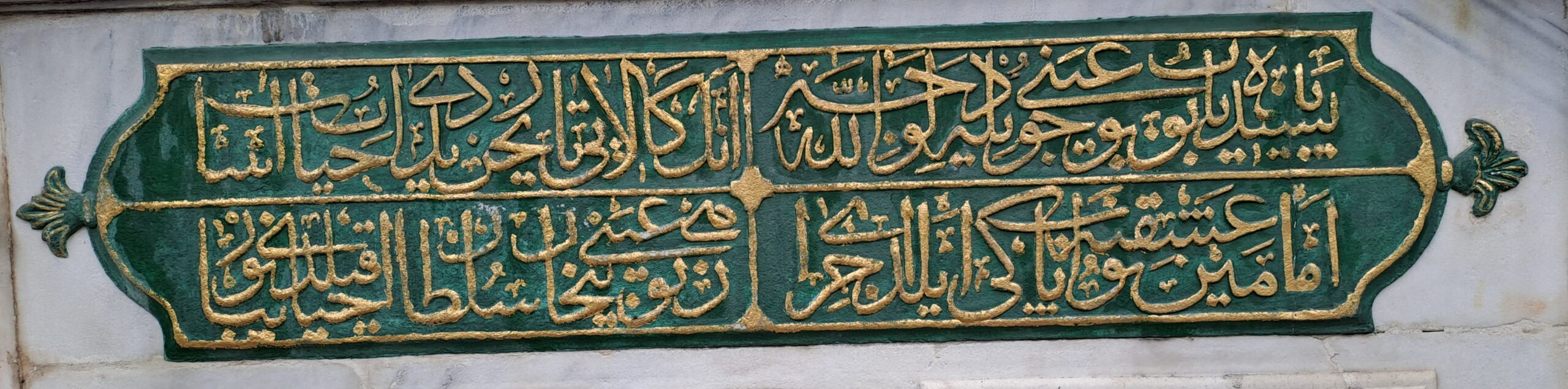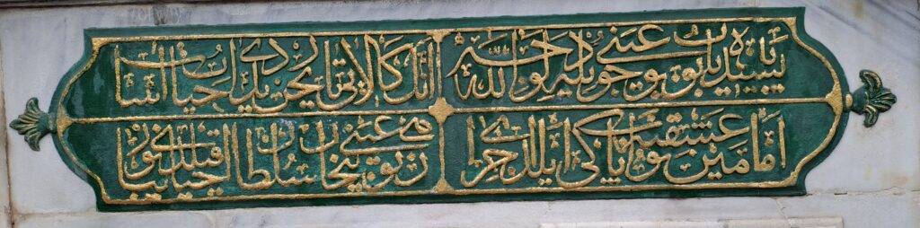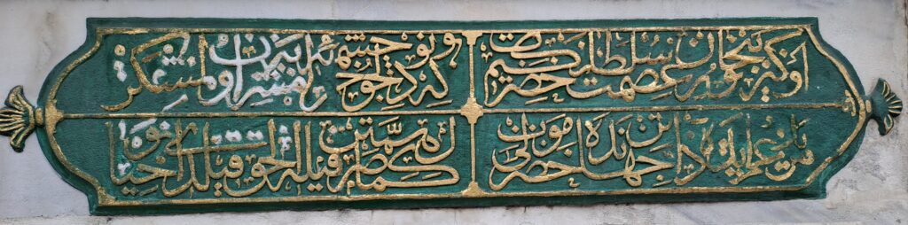 | Tamir Kitabesi 2 parça 2 satır – 2 sütun 1 O ki nûr-ı ismet Hazret-i Beyhan Sultân kim Mezîd-i ömr ede zâtın cihânda Hazret-i Mevlâ 2 Ki bu nev dil-cû çeşme harâbü’l-müşrif olmuşken Kemâl-i himmetin sarfiyle el-hak kıldı nev ihyâ 3 Pesendîde yapıp bu ayn-ı cûdiyle li-vechillâh İmâmeyn aşkına bu âb-ı pâkî eyledi icrâ 4 Onun Kalâyî târîhin dedi âb-ı hayât-âsâ “Zihî bu ayn-ı Beyhân Sultân ihyâ kıldı nev zîbâ” 1233 1 İffet nuru Beyhan Sultan Hazretleri’nin Allah, cihanda ömrünü artırsın. 2 Bu yeni güzel çeşme haraba yüz tutmuşken kemal mertebesindeki himmetini sarf ederek doğrusu ona yeniden hayat verdi. 3 ……….. 4 …………. (E.T:27.1.2022) |