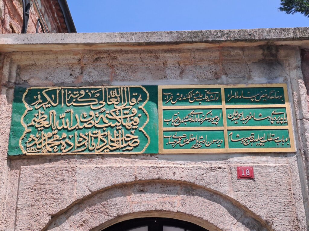 12 Haziran 2025 Perşembe günü özel olarak bu bölgede atladığım Molla Murad Tekkesine geliyoruz. Tekke, Molla Murat Sokağı No:18’de bulunuyor. Tekke, yeni restore edilmiş gibi. Kapalı olduğu için sadece dıştan fotoğraflama imkanı bulduk. Sokağa bakan cephesinde iki katlı bir yapı göze çarpıyor. Google Earth’dan baktığımızda avluda daha büyük kubbeli bir yapının olduğunu görüyoruz. Avlu kapısının üzerinde iki bölümden oluşan bir kitabe yer alıyor. Kitabenin sağında 3 satır – 2 sütunluk talik kitabe solda ise 3 satırlık sülüs yazı ile yazılmış. Kitabenin ikinci satırında Beyyine Suresi 3.ayeti kerimesi yer alıyor. Soldaki kitabenin sol alt kısmında okuyabildiğim kadarıyla 1192 tarihi yazarken sağdaki kitabenin sol altında 1308 tarihi yer alıyor. Tekkenin yola bakan cephesinde tekne kısmı yol seviyesinin altında kalmış yapının bir parçası olarak Molla Murat Tekkesi Çeşmesi yer alıyor. Çeşme, kemeri kırmızı tuğla ile geçilmiş. Aynası, teknesi, dolayısıyla musluğu ve kitabesi bulunmuyor. Yapıyı halen bir STK kullanıyor.