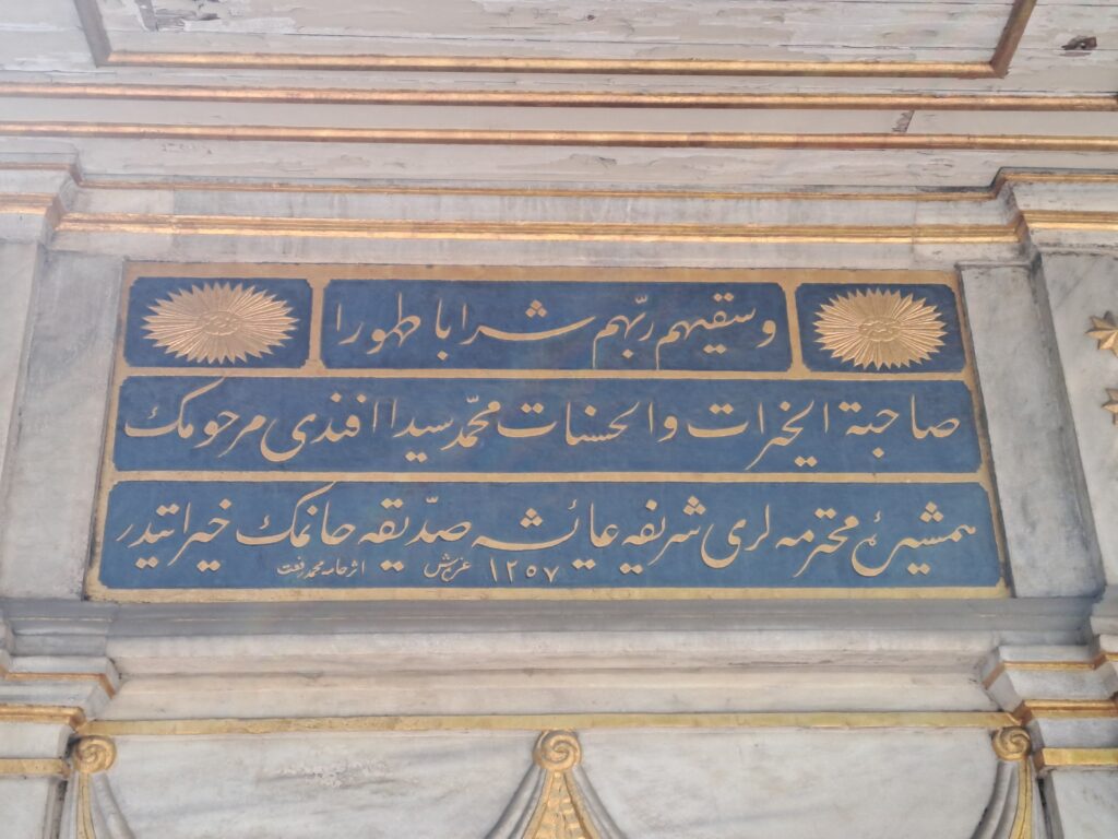 | Şerife Ayşe Sıddıka Hanım Çeşmesi Kitabesi 3 satır 1 “Ve sekkahüm Rabbühüm şeraben tahura” 2 Sahb-ül hayrat vel-hasenat Mehmed Şeyda Efendi merhumun 3 hemşire-i muhteremleri Şerife Ayşe Sıddîka Hanımın hayratıdır. |