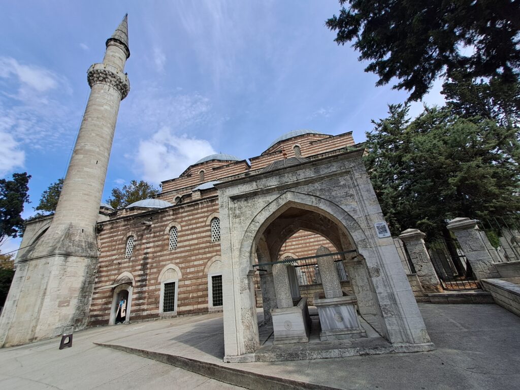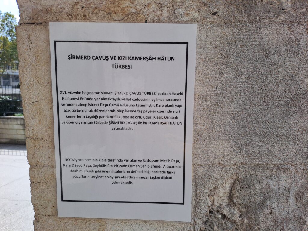 Muratpaşa Caminin dıştan etrafını dört dönüyorum. Birçok açıdan fotoğraf çekiyorum. Avlu dışında Millet Caddesine bakan kısımda onarılmış güzel bir çeşme Muradpaşa Çeşmesi bulunmaktadır. Avluya giriş kapısının önünde prizma tabelada camiye ait bilgiler verilmiş. Caminin avlusunda caminin iki tarafını çevreleyecek kadar bir çok kabir bulunuyor. Avluda ise iki mermer kabir kubbeli yapı altında bulunuyor. Cami duvarındaki mermer tabeladan okuduğumuza göre yanları açık bu türbe Şirmerd Çavuş Türbesi. Kabirlerden birisi Şimerd Çavuş’a diğeri ise kızı Kamerşah Hatun’a aittir. (Şirmerd Çavuş’un asıl adı Abdullah olup Fatih tarafından cesur ve bahadırlığından ötürü kendisine bu isim verilmiştir. Lügatte Farsça Şîr ve Merd kelimelerinin birleşmesiyle oluşmuştur. Şîr: Aslan, mecazen cesur yiğit kahraman anlamlarına gelir). Şimerd Çavuş kızından bir yıl önce 1514 senesinde vefat etmiş. Şirmerd Çavuş Türbesi, Osmanlı mimarlığında 14. yy’dan beri varlıklarına tanık olunan, eski İran mimarisinin tasarımlarını andırmaktadır. Türbe “baldaken” olarak tanımlanan açık türbelerdendir. Türbe 4×4 m boyutlarında, kare bir tabanın üzerine kubbeli bir şekilde oturtulmuştur. Mezarların üstü beton dökülerek kapatılmıştır.