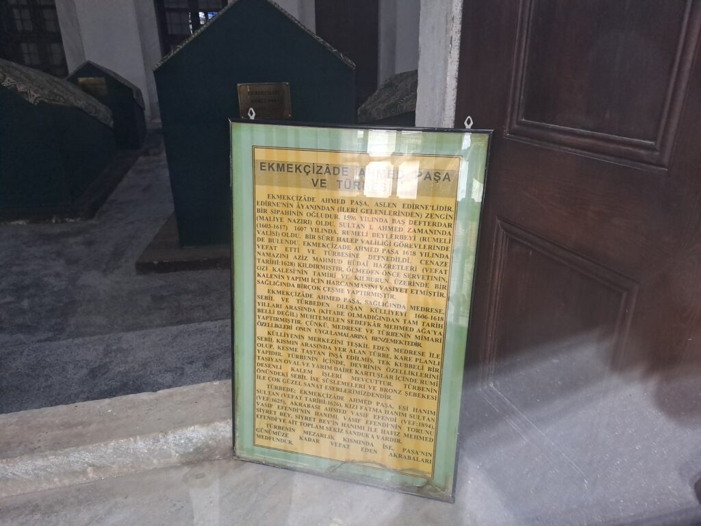 Cemal Yener Tosyalı Caddesi üzerinde sol tarafımızda Ekmekçizade Ahmet Paşa Medresesini ve Haziresini görüyoruz. Medrese yol seviyesinden aşağıda kalmış. “Medrese, yanındaki türbe ve sebil ile birlikte 1606-1618 yıllarında Ekmekçizade Ahmet Paşa tarafından yaptırılmıştır. Kitabesi bulunmadığından yapım tarihi kesinlik kazanmamıştır. Mimarının Sultanahmet Camii’nin mimarı, dönemin mimarbasısı Sedefkâr Mehmet Ağa olduğu tahmin edilmektedir. Ekmekçizoğlu Ahmet Paşa 1606’da başdefterdar (maliye bakanı) olmuş ve 1618 yılında da vefat etmiştir. Kendi yaptırdığı türbesine defnedilmiştir. Türbede yalnız kendi aile efradı bulunmaktadır. Medrese; dikdörtgen planlı bir avluyu çepeçevre saran revakların gerisinde ‘U’ oluşturacak biçimde dizilen hücreler ve ‘U’nun aşık kalan ucuna yerleştirilen dershaneden oluşmaktadır... diye bilgilendirme panosundan okuyoruz. 26 Aralık 2024 tarihinde bölgeden geçerken daha önce dikkatlice bakmadığım medrese penceresinden içeri baktığımda medreseye ait hazireyi görme imkanımız oldu. Yukarıda da bahsedildiği üzere kabirler Ahmet Paşa ve ailesine ait. Yanlış görmedi isem 8 adet sanduka bulunuyor. İçten camın önüne konulan çerçeveli panoda Ekmekçizade Ahmet Paşa ve Türbesi başlığı altında şu bilgiler verilmiş: “Ekmekçizade Ahmed Paşa aslen Edirnelidir. Edirne’nin ayanından (ileri gelenlerinden) zengin bir sipahinin oğludur. 1596 yılında baş defterdar (maliye nazırı) oldu. Sultan I. ahmed zamanında (1603-1617) 1607 yılında, rumeli beylerbeyi (Rumeli Valisi) oldu. Bir süre Halep Valiliği görevlerinde de bulundu. Ekmekçizade Ahmed Paşa 1618 yılında vefat etti ve türbesine defnedildi. Cenaze namazını aziz Mahmud Hüdai Hazretleri (vefat tarihi:1628) kıldırmıştır. Ölmeden önce servetinin, Ozi kalesinin tamiri ve Kılburun üzerinde bir kalenin yapımı için harcanmasını vasiyet etmiştir. Sağlığında birçok çeşme yaptırmıştır. Ekmekçizade Ahmed Paşa, sağlığında medrese, sebil ve türbeden oluşan külliyeyi 1606-1618 yılları arasında (kitabe olmadığından tam tarih belli değil) muhtemelen Sedefkar Mehmed Ağa’ya yaptırmıştır. Çünkü, medrese ve türbenin mimari özellikleri onun uygulamalarına benzemektedir. Külliyenin merkezini teşkil eden medrese ile sebil kısmın arasında yer alan türbe, kare planlı olup, kesme taştan inşa edilmiş, tek kubbeli bir yapıdır. Türbenin içinde devrinin özelliklerini taşıyan oval ve yarım daire kartuşlar içinde Rumî desenli kalem işleri mevcuttur. Türbenin önündeki sebil ise süslemeleri ve bronz şebekesi ile çok güzel sanat eserlerimizdendir. Türbede, Ekmekçizade Ahmed Paşa, eşi Hanım Sultan (vefat tarihi: 1626), kızı Fatma hanım sultan (vef:1625), akrabası Ahmed Vasıf Efendi (vef: 1894), Vasıf Efendi’nin hanımı, Vasıf Efendi’nin torunu Siyret Bey, Siyret Beyin hanımı, ile Hafız Mehmet Efendi’ye ait toplam sekiz sanduka vardır. Türbenin mezarlık kısmında ise, Paşa’nın günümüze kadar vefat eden akrabaları medfundur.” (Ayrıntılı bilgi için İslam Ansiklopedisi Ekmekçizade Ahmed Paşa Medresesi maddesi, E.T:16.11.2021)