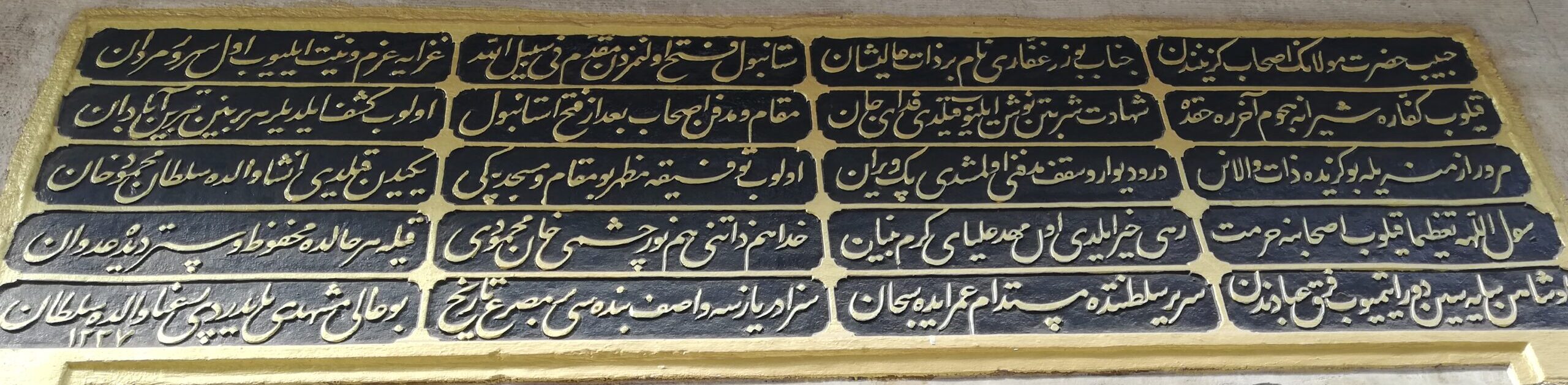 | Ebu Zer el-Gıfari Türbesi Kitabesi 5 satır – 4 sütun H. 1227 / M. 1812-13 1 Habîb-i Hazret-i Mevlâ’nın ashâb-ı güzîninden Cenâb-ı Bû Zer-i Gıfârî nâm bir zât-ı âli-şân 2 Stanbul feth olunmazdan mukaddem fî-sebîlillâh Gazâya azm ü niyyet eyleyip ol server-i merdân 3 Kılıp küffâra şîrâne hücûm âhir reh-i Hakda Şehâdet şerbetin nûş eyleyip kıldı fedâ-yı cân 4 Makâm u medfen-i ashâbı baʻd-ez feth-i İstânbûl Olup keşf eylediler her birinin kabrin âbâdan 5 Mürûr-ı ezmineyle bu güzîde zât-ı vâlânın Der ü divâr ü sakf-ı medfeni olmuştu pek vîrân 6 Olup tevfîka mazhar bu makâm u mescid-i pâki Yeniden kıldı inşâ Vâlide Sultân-ı Mahmûd Hân 7 Resûlullâha taʻzîmen kılıp ashâbına hürmet Zihî hayr eyledi ol mehd-i ulyâ-yı kerem-bünyân 8 Hudâ hem zâtını hem nûr-ı çeşm-i Hân Mahmûd’u Kıla her hâlde mahfûz u setr-i dîde-i udvân 9 O şâhın sâyesin dûr etmeyip fark-ı ibâdetten Serîr-i saltanatta müstedâm-ı ömr ede Sübhân 10 Sezâdır yazsa Vâsıf bendesi bu mısraʻ-ı târîh “Bu âli meşhedi yaptırdı raʻnâ Vâlide Sultân” H. 1227 1 Allah Resulü’nün seçkin dostlarından şanı yüce bir zat olan Ebu Zer-i Gıfari Hazretleri, 2 İstanbul fethedilmeden önce Allah yolunda gazaya çıkan bir mertler serveridir. 3 Kâfirlere aslancasına hücum edip sonunda Hak yolunda şehadet şerbetini içerek canını feda etti. 4 İstanbul’un fethinden sonra ashab-ı kiramın makam ve medfenlerini bulup her birinin kabrini ihya ettiler. 5 Zaman içinde bu seçkin ve yücezatın türbelerinin kapısı, duvarı, kubbesi pek viran olmuştu. 6 Sultan Mahmut’un annesi Valide Sultan Allah’ın yardımına mazhar olup bu tertemiz makam ve mescidi yineden inşa ettirdi. 7 Mayası cömertlik olan o padişah annesi Hz. Peygamber’e saygıdan ashabına hürmet edip ne de güzel bir hayır eseri yaptı. 8 Allah, hem onu hem de Sultan Mahmut’un gözü nurunu her halükârda düşman gözünden koruyup gözetsin. 9 O padişahın gölgesini ibadet üzerinden uzak etmesin. Ömrünü saltanat tahtında daim kılsın. 10 Hizmetkârı Vasıf, “Valide Sultan bu yüce türbeyi pek güzel yaptırdı” cümlesini tarih mısraı olarak yazsa lâyıktır. Kaynak: Kitabelerin Kitabı Fatih E.T: 4.3.2023) |