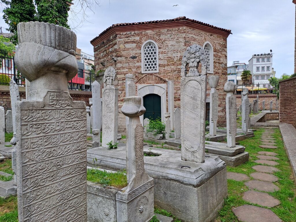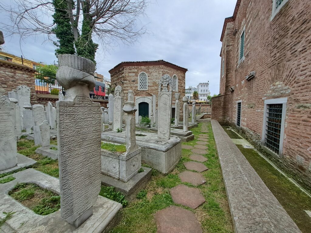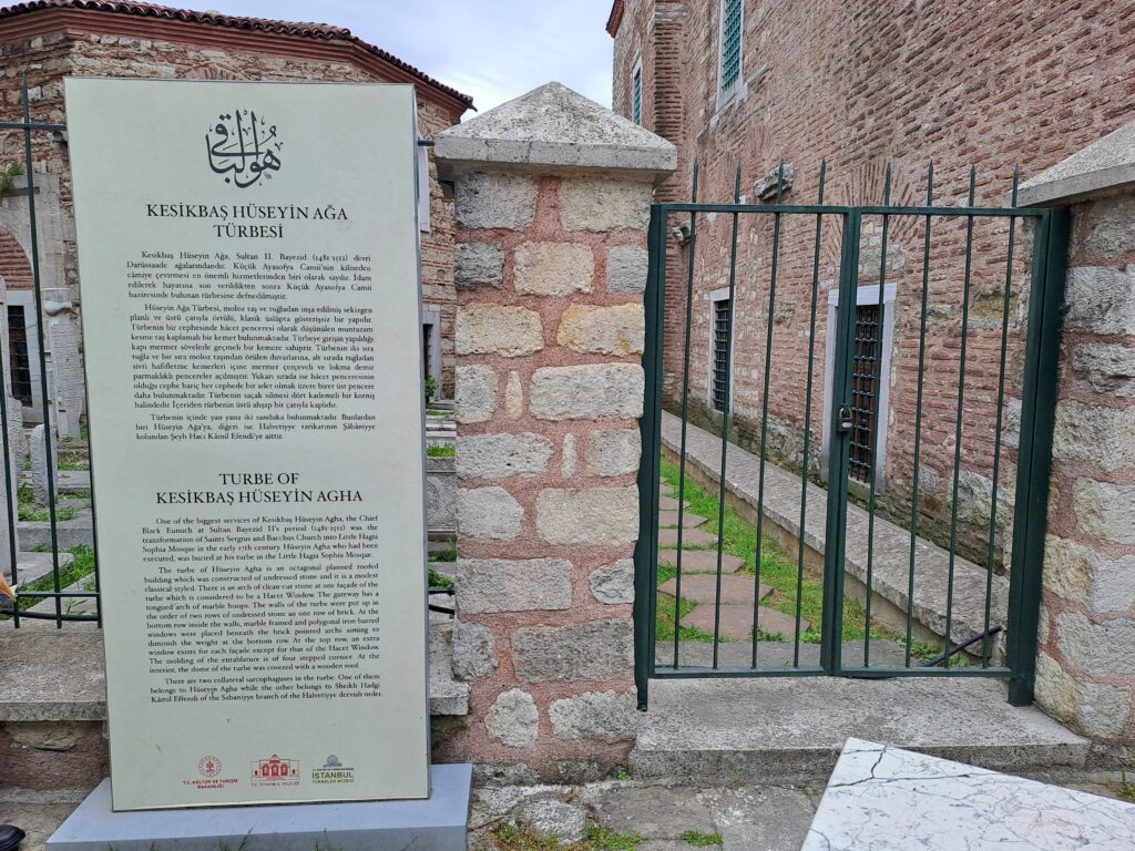 Küçük Ayasofya Camii Haziresinde çok sayıda kabir yer alıyor. Cami avlusuna girişte solda hazire de yer alan büyük bir tabela dikkat çekiyor. Kesikbaş Hüseyin Ağa Türbesi. Tabeladan Hüseyin Ağa’nın kısa hayat hikayesi ve türbenin mimari yapısı ile ilgili yazılanları okuyoruz: “Kesikbaş, Hüseyin Ağa, Sultan Bayezid devri Darüssade ağalarındandır. Küçük Ayasofya Camisinin kiliseden camiye çevirmesi en önemli hizmetlerinden sayılır. İdam edilerek hayatına son verildikten sonra Küçük Ayasofya Camii haziresinde bulunan türbesine defnedilmiştir. Hüseyin Ağa Türbesi, moloz taş ve tuğladan inşa edilmiş sekizgen planlı ve üstü çatıyla örtülü, klasik üslupta gösterişsiz bir yapıdır. Türbenin bir cephesinde hacet pencere olarak düşünülen muntazam kesme iş kaplamalı bir kemer bulunmaktadır. Türbeye girişin yapıldığı kapı mermer sövelerle geçmeli bir kemere sahiptir… Türbenin içinde yan yana iki sanduka bulunmaktadır. Bunlardan biri Hüseyin Ağa’ya diğeri ise Halvetiyye tarikatının Şabaniye kolundan Şeyh Hacı Kamil Efendi’ye aittir.” Türbeyi uzaktan da olsa fotoğraflıyoruz.