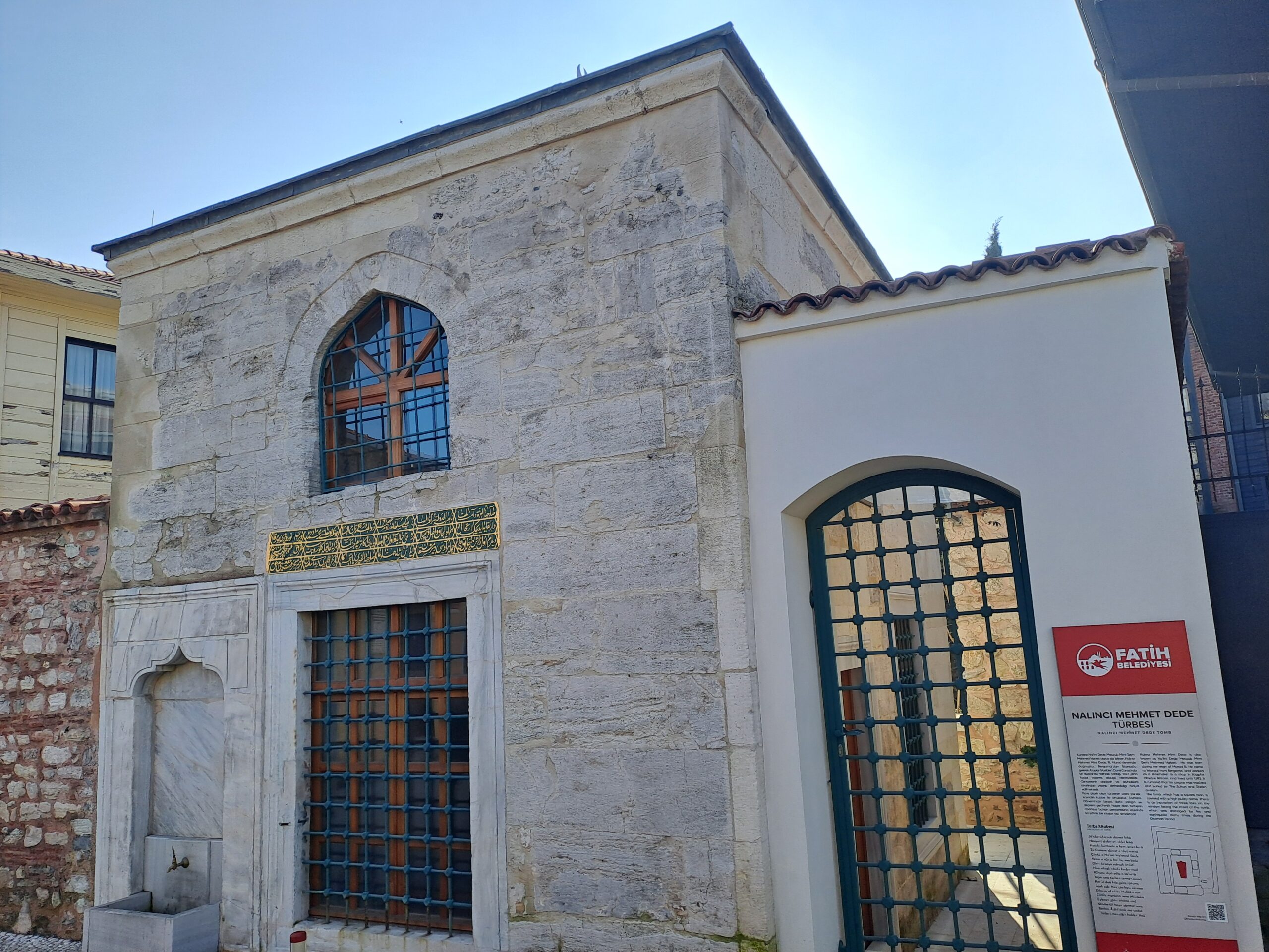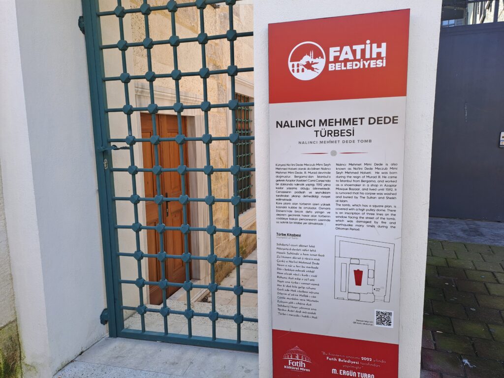 7 ağustos 2022 tarihinde bölgeyi gezerken türbe ve çeşme etrafı restore edilmek üzere kapatılmıştı. Bu sebeple görememiştik. 23 Ocak 2025 tarihinde Üsküplü Caddesi üzerinde bulunan Nalıncı Mehmed Dede Türbesi ve Çeşmesinin restorasyonu Fatih Belediyesince bitirilmişti. Türbenin önünde Fatih Belediyesi tarafından hazırlanan tabelada şu bilgileri okuyoruz: “Künyesi Na’lini Dede Meczub Mimi Şeyh Mehmed Halveti olarak da bilinen Malıncı Mimi Dede, III. Murad devrinde doğmuştur. Bergama’dan İstanbul’a gelerek Azaplar (Azebler) Camii Çarşısında bir dükkanda nalıncılık yapmış olduğu bilinmektedir. Cenazesinin padişah ve şeyhülislam tarafından yıkanıp defnedildiği rivayet edilmektedir. Kare planlı olan türbenin üzeri kasnaklı kubbe ile örtülüdür. Osmanlı Dönemi’nde birçok defa yangın ve deprem geçirerek hasar alan türbenin caddeye bakan penceresinin üzerinde üç satırlık bir kitabe yer almaktadır.” Bu açıklamanın altında kitabenin metni latinize olarak verilmiş. Kitabe, türbenin caddeye bakan cephesinde 3 satır 6 sütun olarak verilmiş. Türbe kapısı kapalı idi. Pencereden içerisini fotoğrafladık. Türbe içerisinde tek bir sanduka bulunuyor.