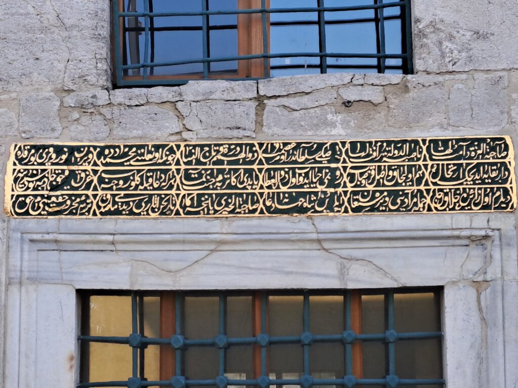 | 1 …………? ……………….. 2 O namus timsali, himmet sahibi, kadınların tacı Haseki Sultan’dır. 3 Bu türbeye nur ve aydınlık veren Nalıncı Mehmet Dede’dir. 4 Ahrete göçüp Allah’a kavuşma yakınlığına erişince o ihsan sahibi 5 ruhuna hayat verip ona cennet nümunesi bir türbe yaptı. 6 Gelip ruhuna dua edenleri Allah, yakınlığı nuruna gark etsin. 7 Allah’ın, o zata ahlaktan bütün istediğini vermesini dilerim. 8 Cihan padişahına dua eyleyen, bu hayır sahibesini nasıl unutsun? 9 Âsari, tarihini dosdoğru bir şekilde “Hakk’ın gerçek meczubunun türbesi” diye söyledi. Kaynak: Kitabelerin Kitabı Fatih (E.T: 25.1.2025) |