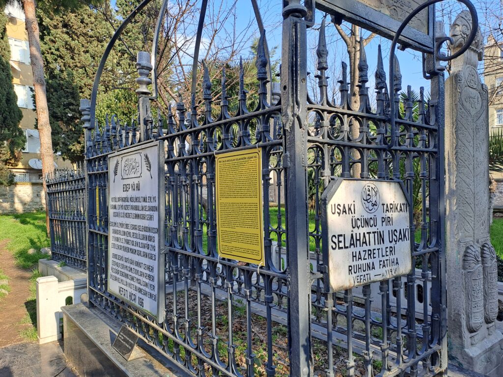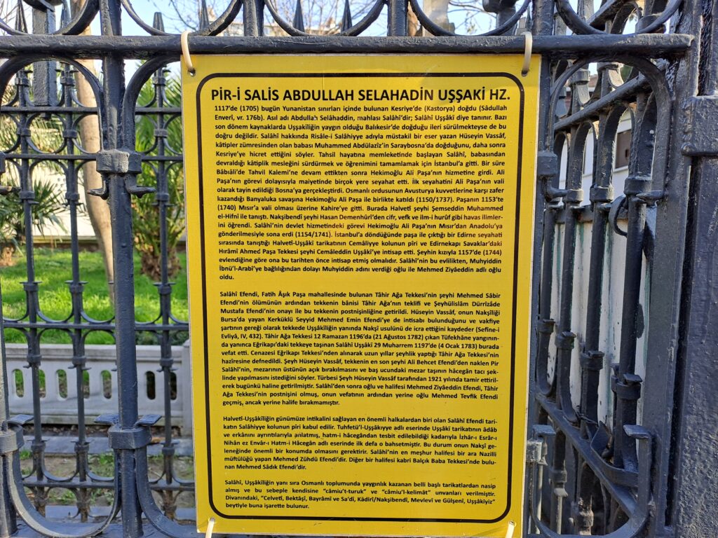 Bugünkü gezimizin sonuna yaklaşıyoruz. Şair Baki Sokaktan tekrar Esrar Dede Sokağına ulaşıyoruz. Bu kez tam karşımızda türbe ve kısa ahşap minareli camii gözüküyor. Türbe ve çevresi İBB Miras tarafından Seyyid Velayet Türbesi ile birlikte restore edilmiş. Türbe kapalı idi. Türbe önündeki tabelada Asude Hatun Türbesi ve Selahaddin Uşşaki Türbesi yazıları altında şu bilgilere ulaşıyoruz: “Asude Hatun Türbesi, Tahirağa Camisinin kuzeyinde konumlanan Asude Hatun Türbesi, II. Bayezid’in sütannesi Asude Hatun’a aittir. Klasik mimari üslupta, kesme taştan, çokgen planlı olarak inşa edilen Asude Hatun Türbesinin üzeri yüksek kasnaklı bir kubbeyle örtülüdür. Türbe kapısının hemen üstünde, sülüs hatlı bir kitabe mevcuttur.” Kitabesinden H.917 tarihinde inşa edildiğini anlıyoruz. Aynı tabelada Selahaddin Uşşaki Türbesi başlığı altında: “Şeyh Abdullah Selahaddin Uşşaki (ö. H 1196 /m1783), tekkenin postnişinlerinden olup, Halvetiyye’nin Uşşaki kolundan Salahi şubesinin kurucusudur. Abdullah Salahi ve Abdi Efendi isimleriyle de bilinen Selahaddin Uşşaki, tahsilini sürdürmek için İstanbul’a gelmiş, burada çeşitli resmi görevlerde bulunmuş, uzun süre divan efendisi olarak Sadrazam Hekimoğlu Ali Paşa’nın (ö. 1758) maiyetinde yer almıştır. 1761’de ise Fatih’teki Tahir Ağa Tekkesinin meşihatını üstlenmiş, vefatına kadar bu tekkede irşat faaliyetlerini sürdürmüştür.” Uşşaki Türbesi yazmasına rağmen avluda sadece tek bir kapalı türbe gördük. Avluda etrafı açık demir korkuluklarla çevreli Selahaddin Uşşaki kabrini görüyoruz. Korkuluk üzerinde mermer bir tabelada Edep Ya Hu başlığı altında latinize kitabe yer alıyor. Hemen yanında A3 ebatında fotoblok tabelada ise uzunca bir metin ile Pir-i Salis Abdullah Selahaddin Uşşaki Hz. başlığı altında hayatı anlatılmış. H.1117 / 1705 tarihinde bugün ki Yunanistan sınırları içerisinde yer alan Kesriye’de (Kastorya) da doğmuş. Uşşaki hazretlerinin kabri yanında Şeyh Mehmet Esad Dede’nin Kabri bulunmaktadır.